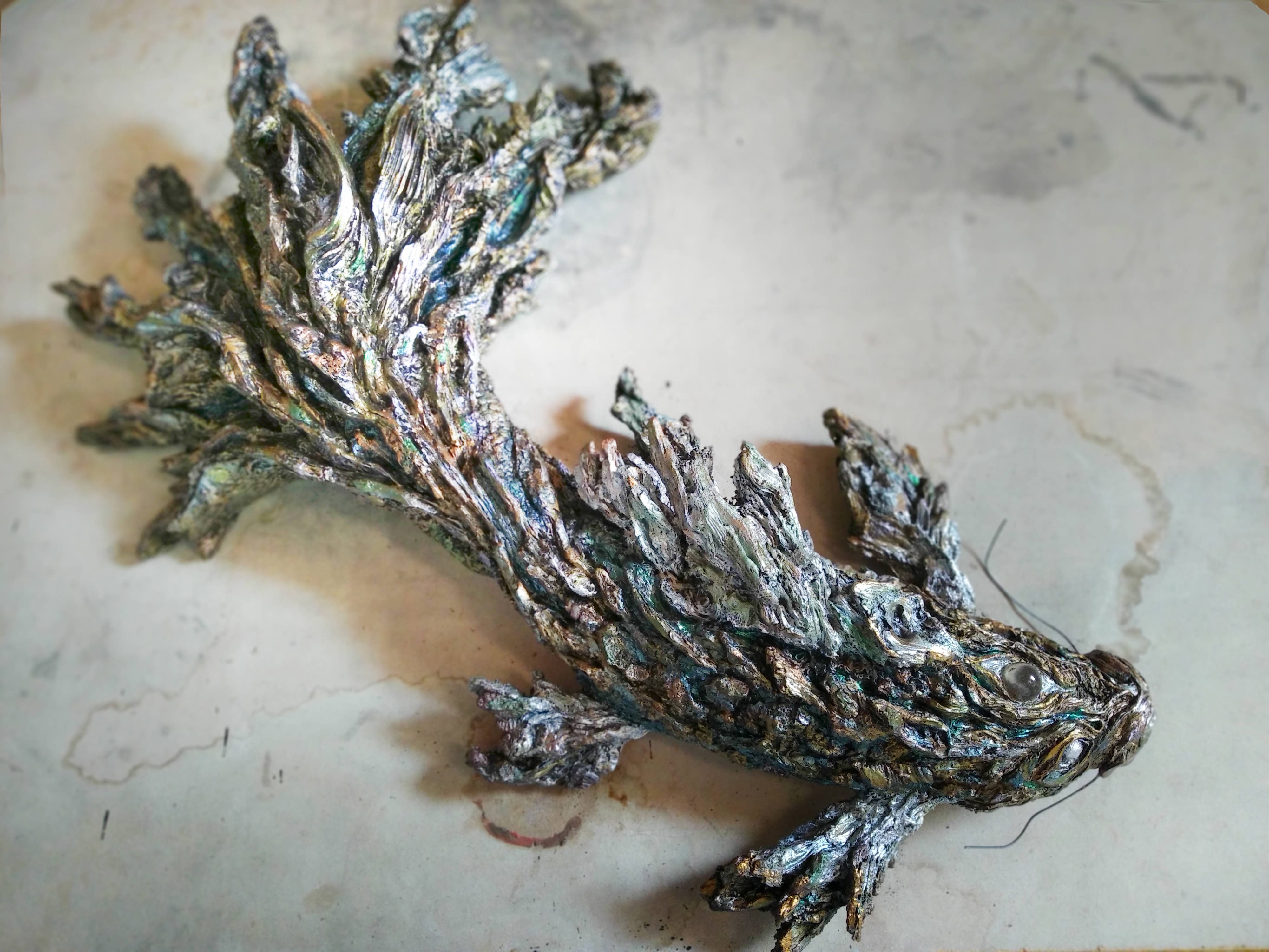 Ale zpátky k mým sochám: V určitý moment se začne chtít nějaká vnější forma propojit - zasnoubit s určitým vnitřním archetypem, který ve mně již delší dobu zraje. Myšlenka (nápad, idea, …) se rozhodla vstoupit do hmoty. Najednou jako by bylo vše už vedeno a mé ruce jen naslouchají. Je to pro mě jako tanec s hmotou, spolupráce s ní, ale občas i rozlad, kdy je nutné hledat kompromisy. Je to fáze nejkreativnější a zároveň nejnáročnější. Vybírám ze stovek dřívek i jiných přírodnin ty pravé „padnoucí“ kousky a vytvářím ve hmotě obraz, který si postupně sám diktuje, jak má vypadat. Tvary skládám i modeluji „chybějící“ části dle předlohy, která leží pravděpodobně v dimenzi, kterou lidé ještě přesně nepojmenovali, ale říkejme jí třeba fantazie.
