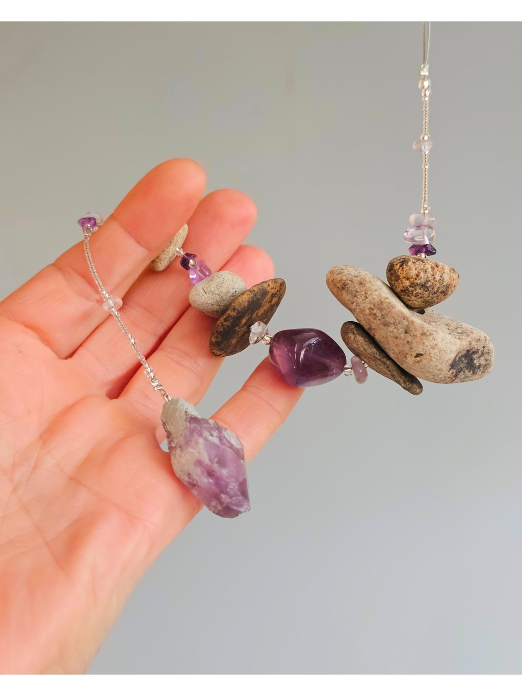 Říční kameny s krystalem ametystu – Ručně tvořený přírodní bytový šperk z Ohře