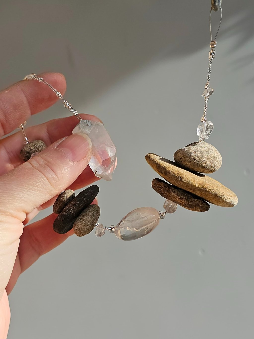 Závěsná kamenná kompozice s krystalem křišťálu – Ručně tvořený přírodní bytový šperk z Ohře