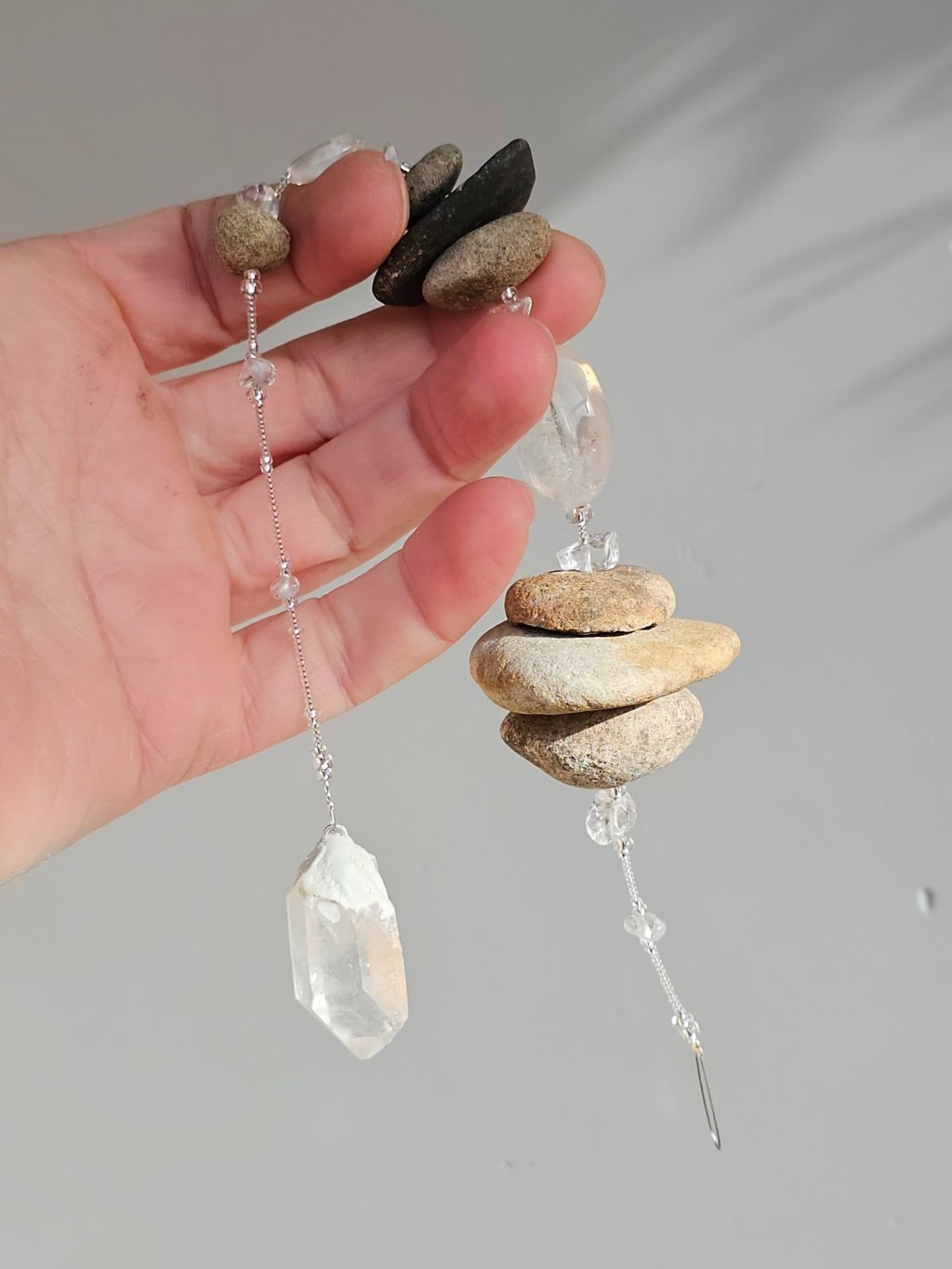 V těchto něžných kamenných dekoracích pro vás oživuji vlastnoručně nasbírané oblázky z břehů milované řeky Ohře (Agary). Kamínky nacházím v meandrech na Libochovicku – vybírám měkčí a lehounké sedimenty jako jílovce, slínovce, prachovce a opuky, které řeka ohladila a obohatila o unikátní kresbu. Tyto nenápadné pamětníky pradávného českého moře kombinuji s českým rokajlem Preciosa a přírodními krystaly či surovými kousky polodrahokamů (ametyst, křišťál, růženín). Závěsné krystaly podporují tok chi v duchu umění Feng shui.