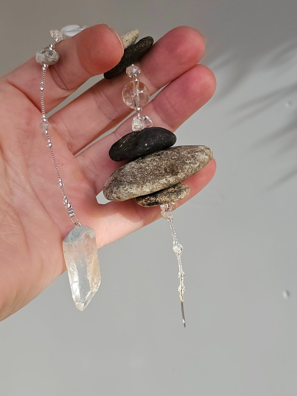 V těchto něžných kamenných dekoracích pro vás oživuji vlastnoručně nasbírané oblázky z břehů milované řeky Ohře (Agary). Kamínky nacházím v meandrech na Libochovicku – vybírám měkčí a lehounké sedimenty jako jílovce, slínovce, prachovce a opuky, které řeka ohladila a obohatila o unikátní kresbu. Tyto nenápadné pamětníky pradávného českého moře kombinuji s českým rokajlem Preciosa a přírodními krystaly či surovými kousky polodrahokamů (ametyst, křišťál, růženín). Závěsné krystaly podporují tok chi v duchu umění Feng shui.