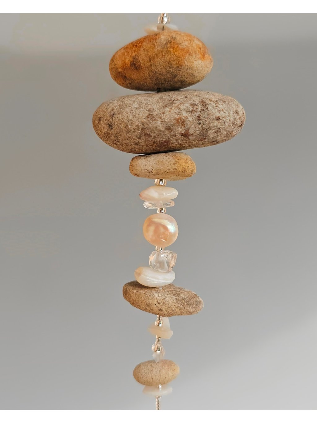 V těchto něžných kamenných dekoracích pro vás oživuji vlastnoručně nasbírané oblázky z břehů milované řeky Ohře (Agary). Kamínky nacházím v meandrech na Libochovicku – vybírám měkčí a lehounké sedimenty jako jílovce, slínovce, prachovce a opuky, které řeka ohladila a obohatila o unikátní kresbu. Tyto nenápadné pamětníky pradávného českého moře kombinuji s českým rokajlem Preciosa a přírodními krystaly či surovými kousky polodrahokamů (ametyst, křišťál, růženín). Závěsné krystaly podporují tok chi v duchu umění Feng shui.