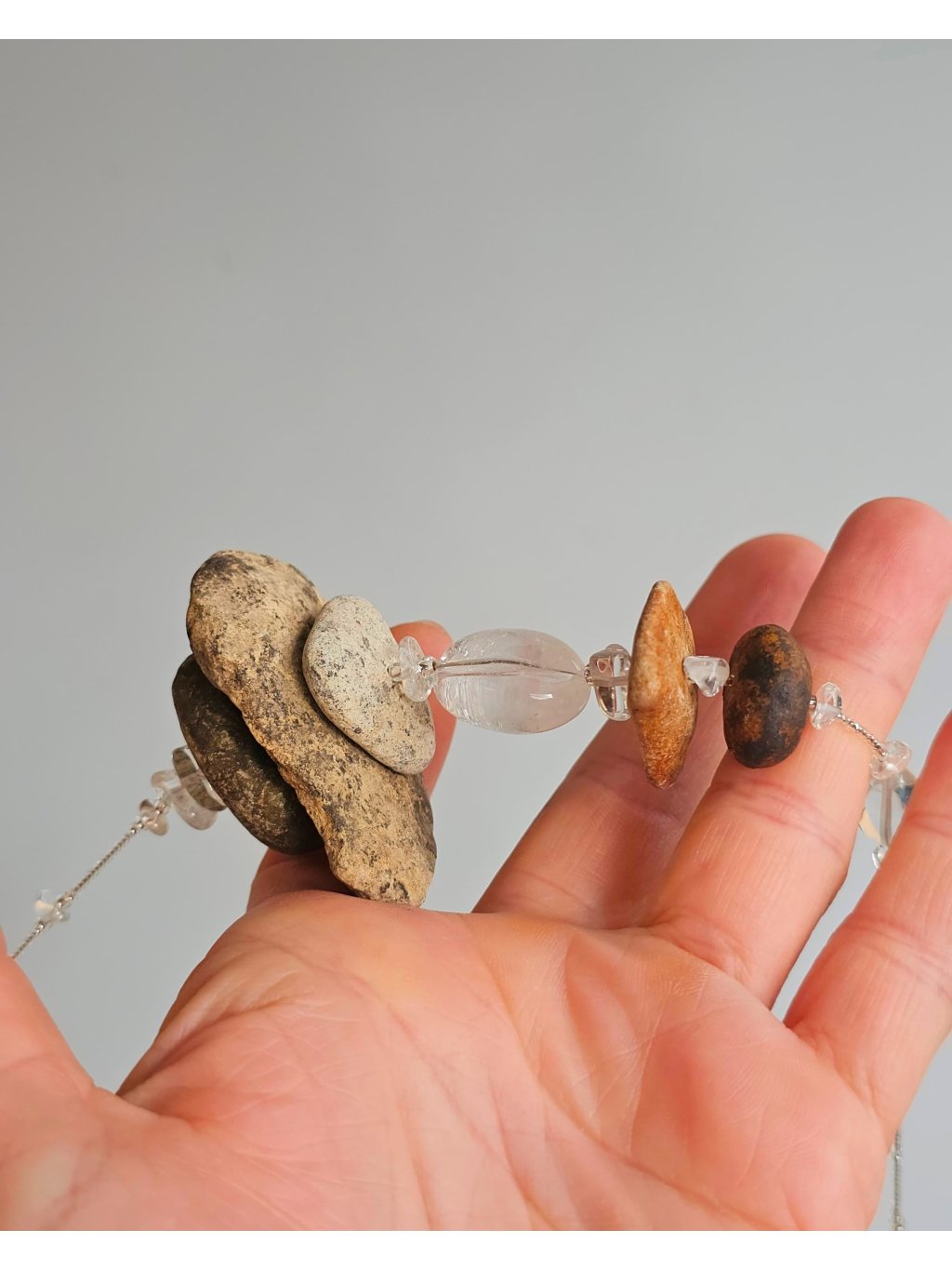 V těchto něžných kamenných dekoracích pro vás oživuji vlastnoručně nasbírané oblázky z břehů milované řeky Ohře (Agary). Kamínky nacházím v meandrech na Libochovicku – vybírám měkčí a lehounké sedimenty jako jílovce, slínovce, prachovce a opuky, které řeka ohladila a obohatila o unikátní kresbu. Tyto nenápadné pamětníky pradávného českého moře kombinuji s českým rokajlem Preciosa a přírodními krystaly či surovými kousky polodrahokamů (ametyst, křišťál, růženín). Závěsné krystaly podporují tok chi v duchu umění Feng shui.