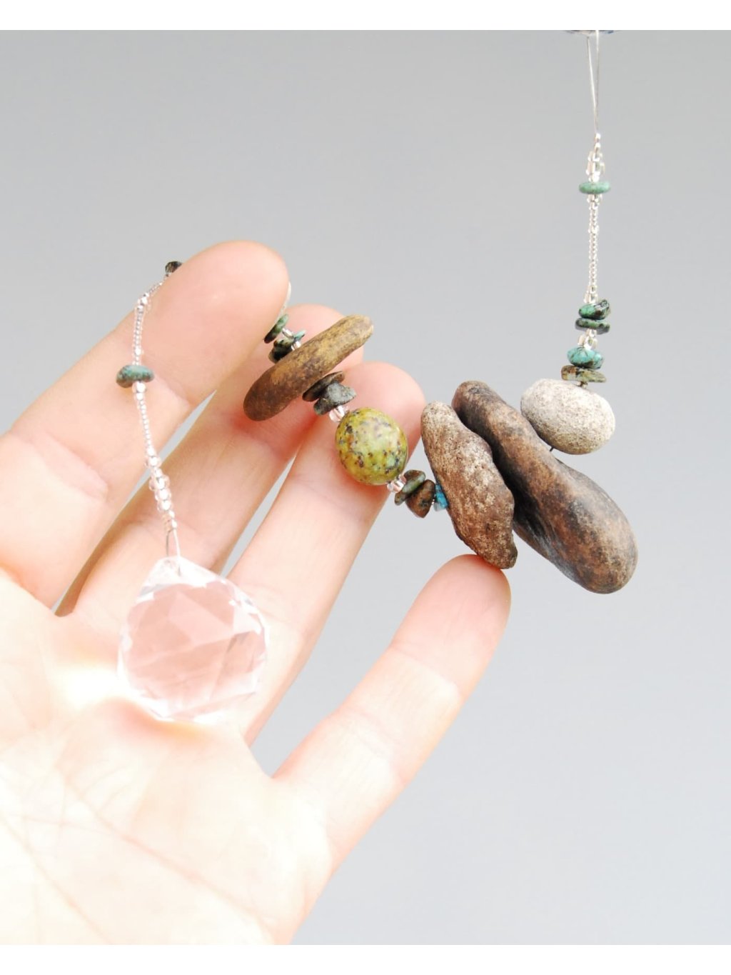 Tyto nenápadné pamětníky pradávného českého moře kombinuji s kvalitním českým rokajlem Preciosa, přírodními polodrahokamy a skleněnými broušenými lapači slunce, které v duchu umění Feng shui podporují v prostoru tok chi. Při průchodu světla vám roztančí po místnosti stovky duhových světélek.