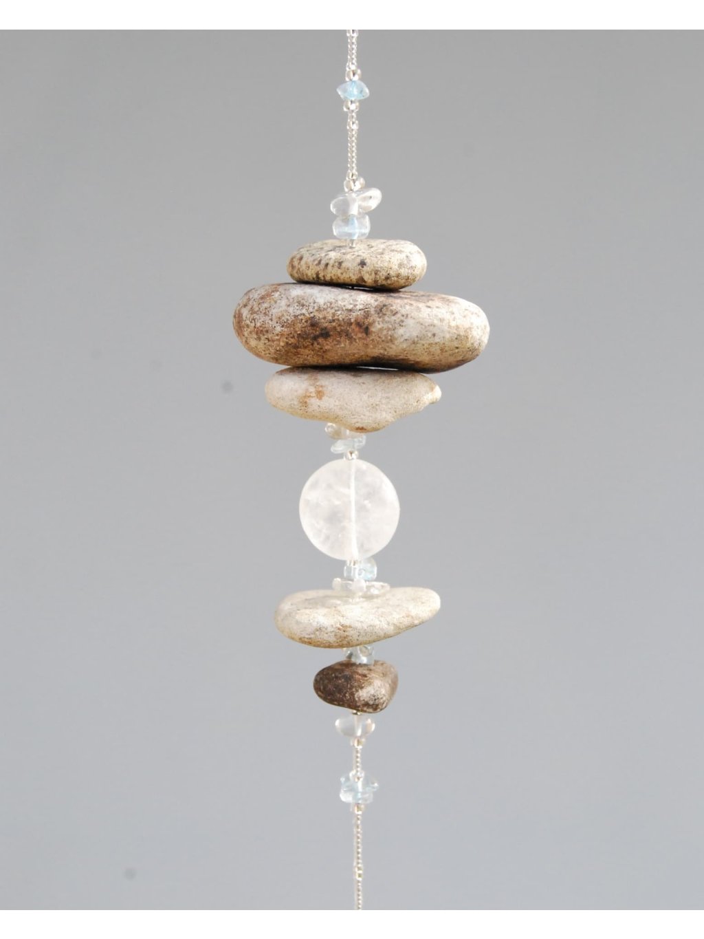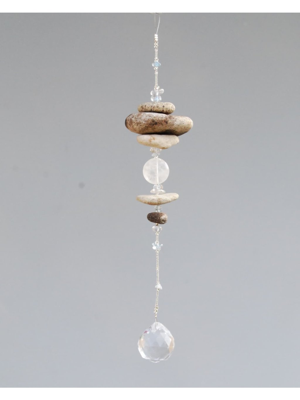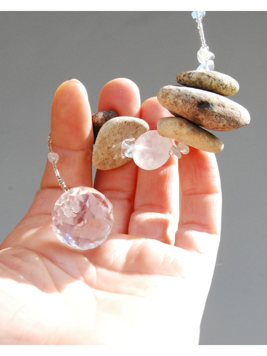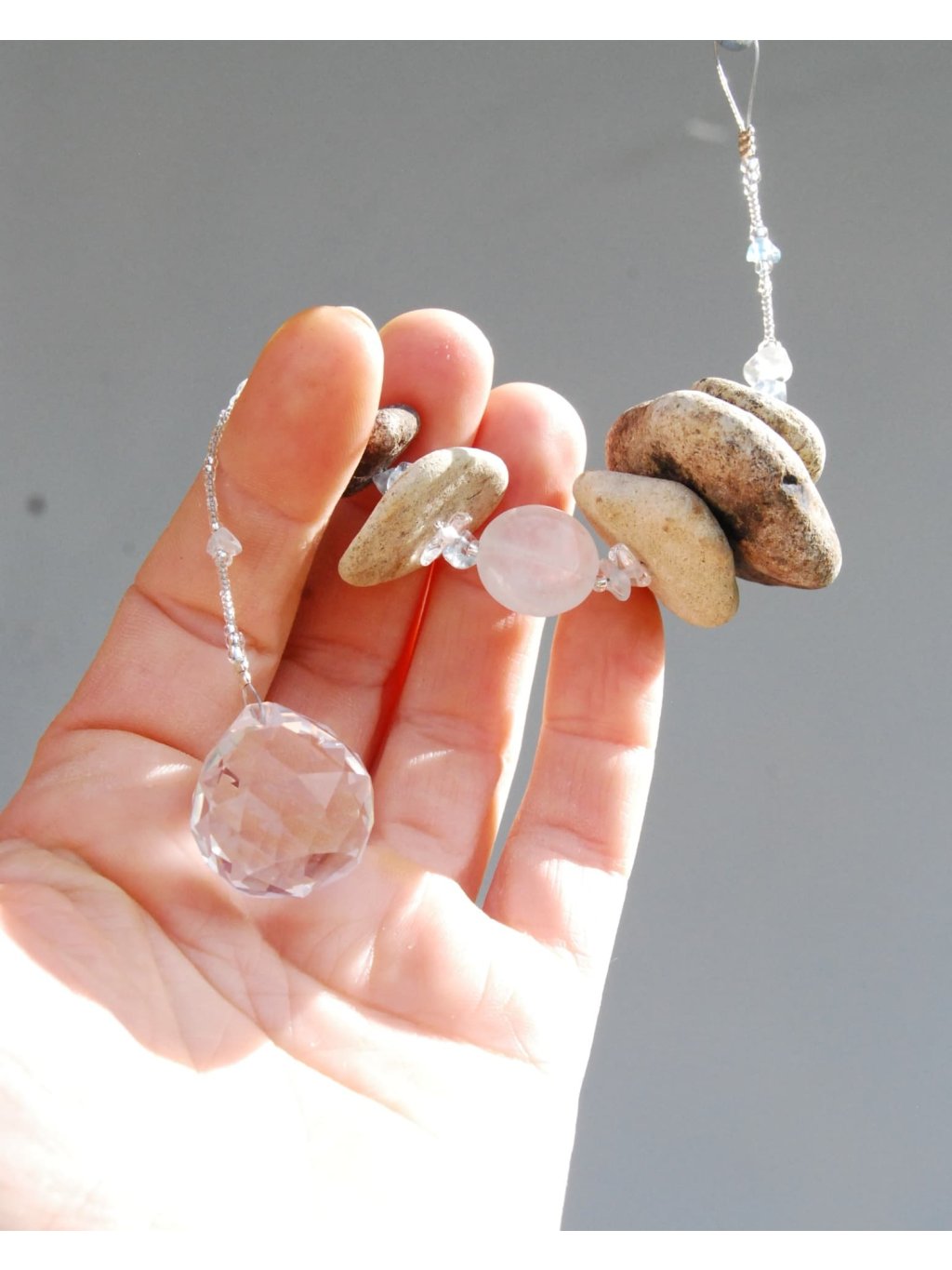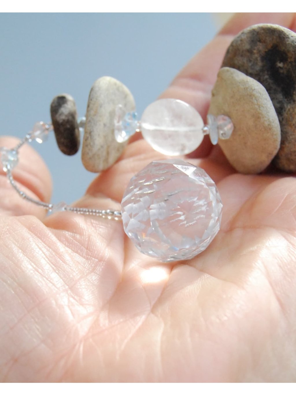 Tyto nenápadné pamětníky pradávného českého moře kombinuji s kvalitním českým rokajlem Preciosa, přírodními polodrahokamy a skleněnými broušenými lapači slunce, které v duchu umění Feng shui podporují v prostoru tok chi. Při průchodu světla vám roztančí po místnosti stovky duhových světélek.