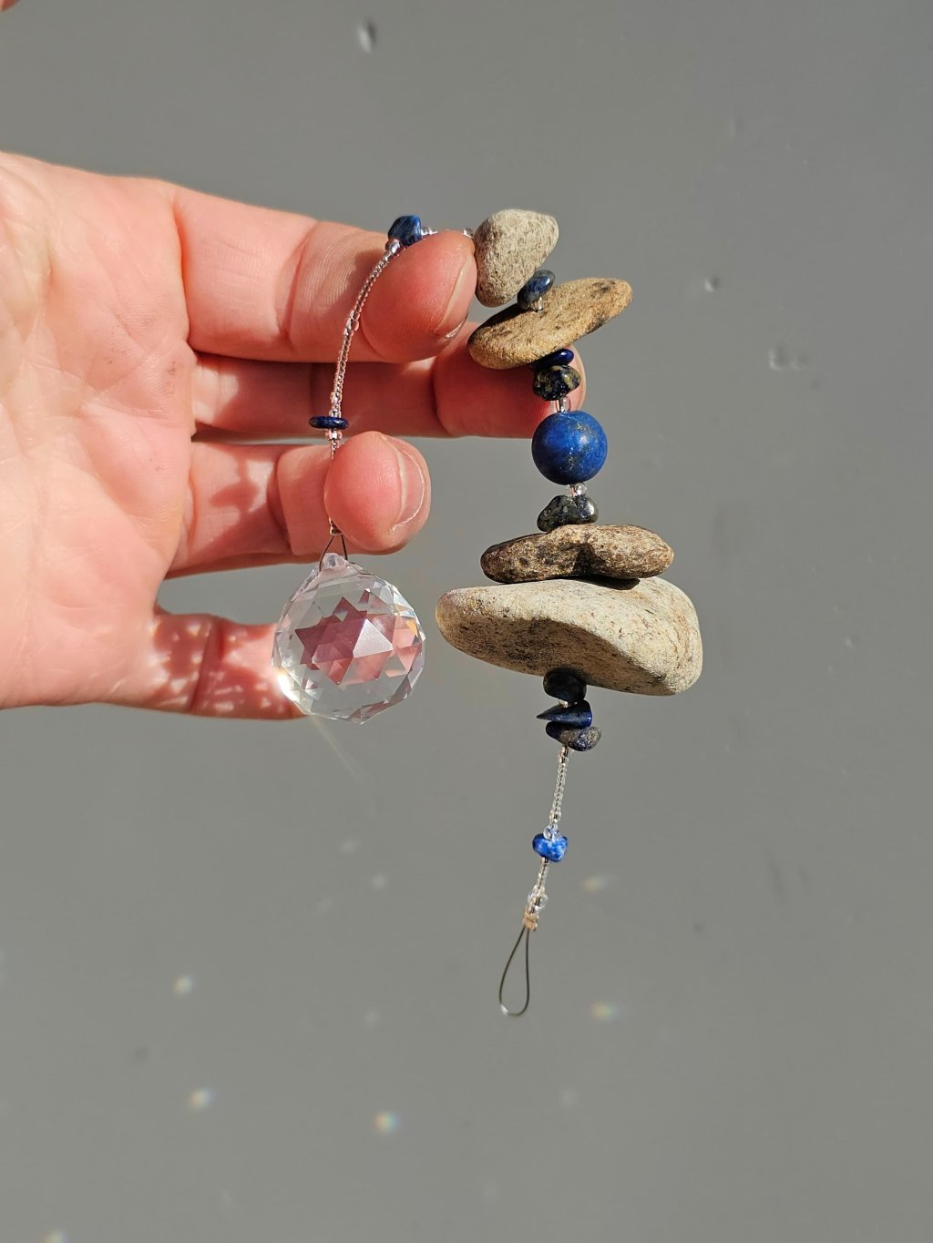 Tyto nenápadné pamětníky pradávného českého moře kombinuji s kvalitním českým rokajlem Preciosa, přírodními polodrahokamy a skleněnými broušenými lapači slunce, které v duchu umění Feng shui podporují v prostoru tok chi. Při průchodu světla vám roztančí po místnosti stovky duhových světélek.