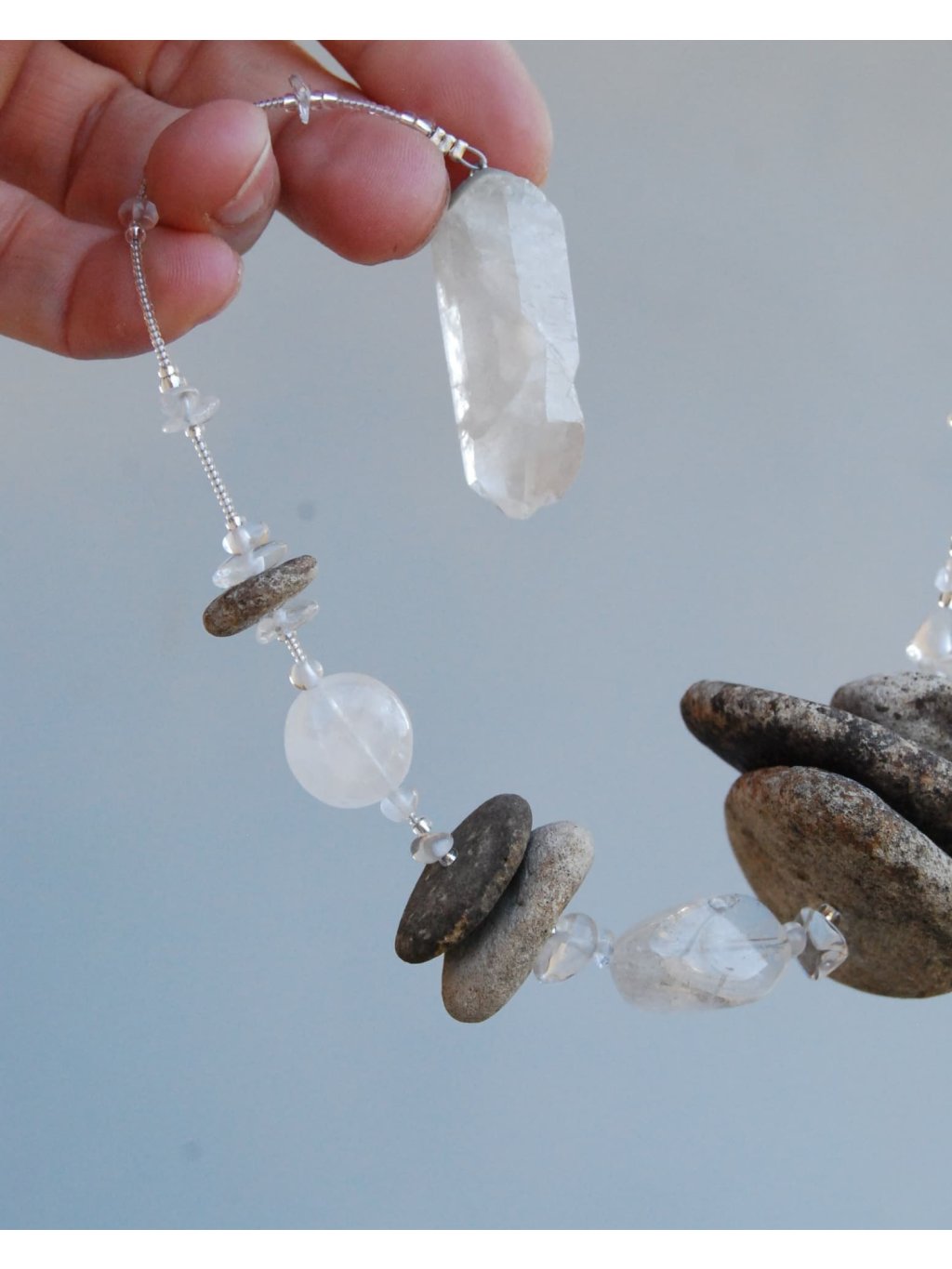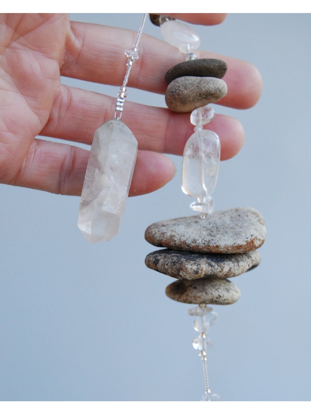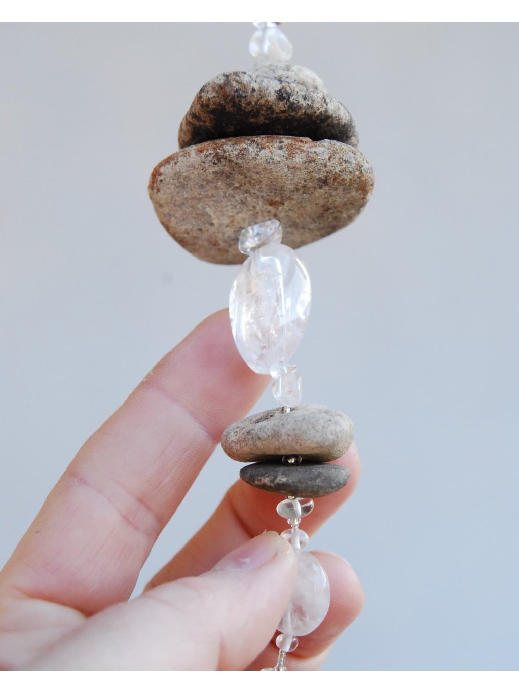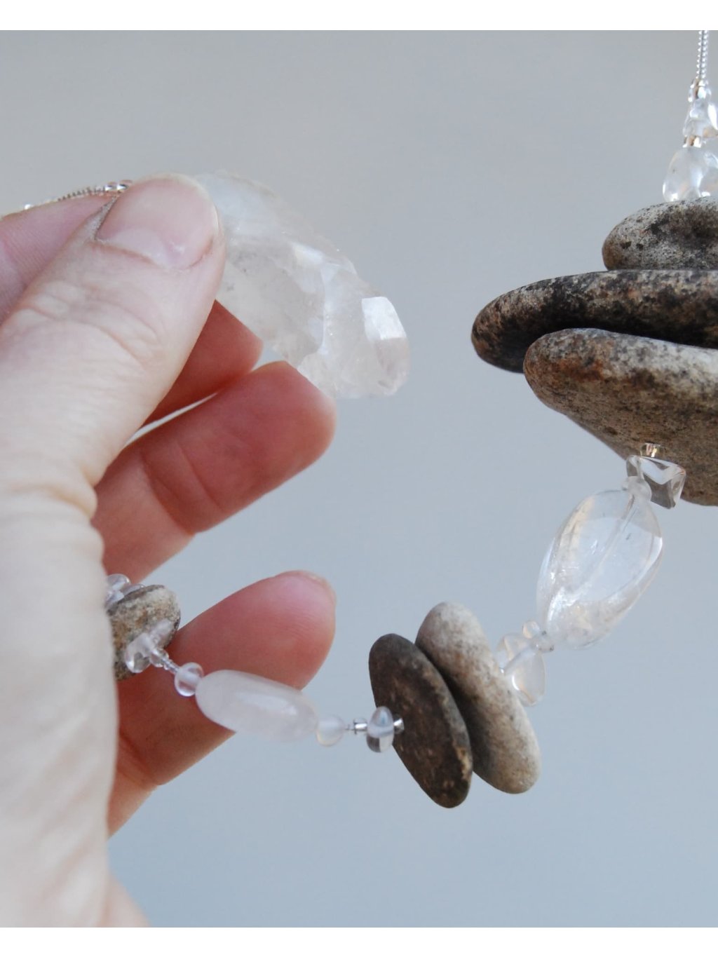 Tyto kamenné závěsné kompozice pro vás tvořím z říčních kamenů, které sbírám v naší milé Ohři nebo na jejích přírodních plážích. Malé oblázky kombinuji s českým rokajlem a vzácnými minerály.
