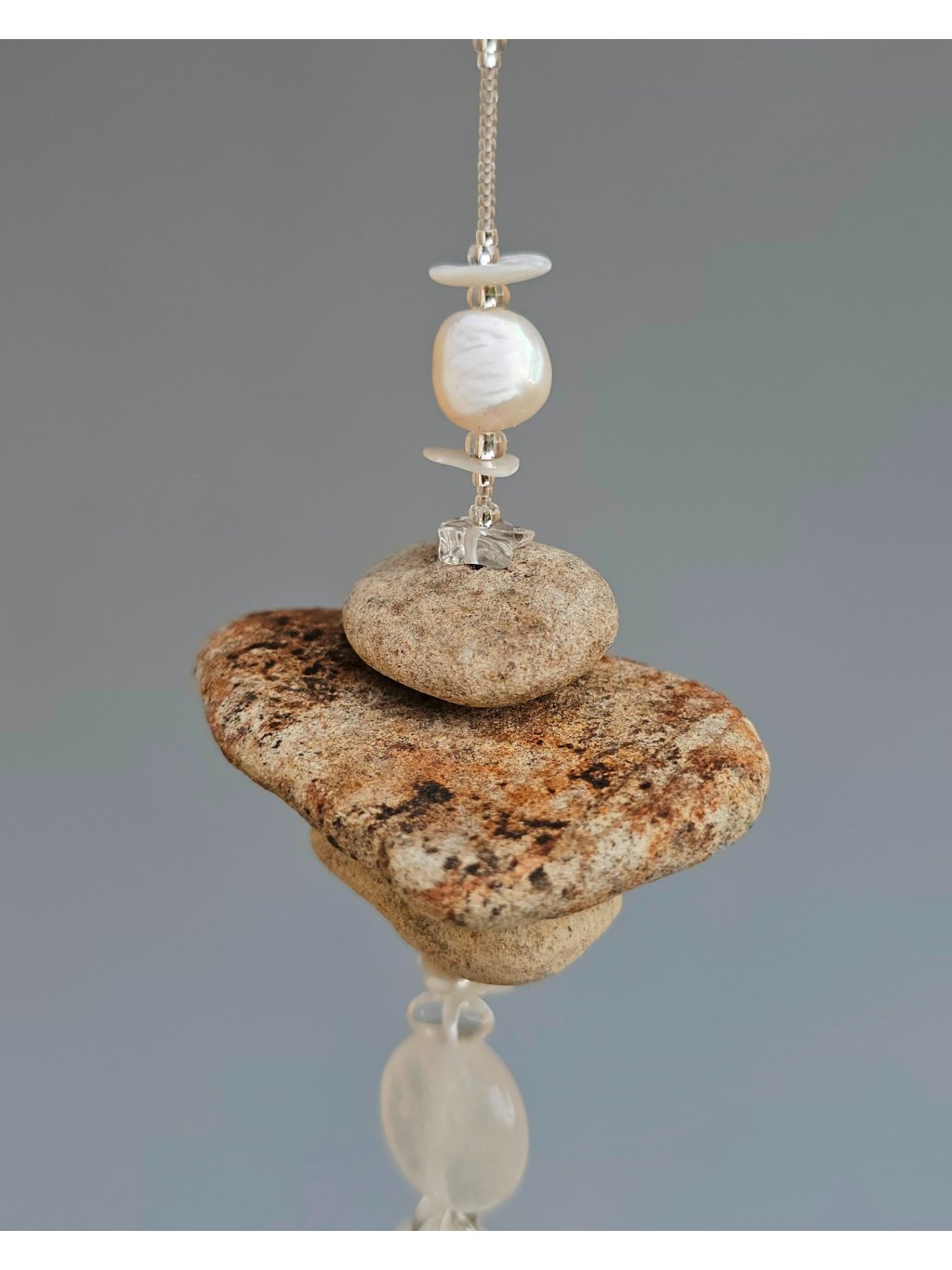 V těchto něžných kamenných dekoracích pro vás oživuji vlastnoručně nasbírané oblázky z břehů milované řeky Ohře (Agary). Kamínky nacházím v meandrech na Libochovicku – vybírám měkčí a lehounké sedimenty jako jílovce, slínovce, prachovce a opuky, které řeka ohladila a obohatila o unikátní kresbu. Tyto nenápadné pamětníky pradávného českého moře kombinuji s českým rokajlem Preciosa a přírodními krystaly či surovými kousky polodrahokamů (ametyst, křišťál, růženín). Závěsné krystaly podporují tok chi v duchu umění Feng shui.