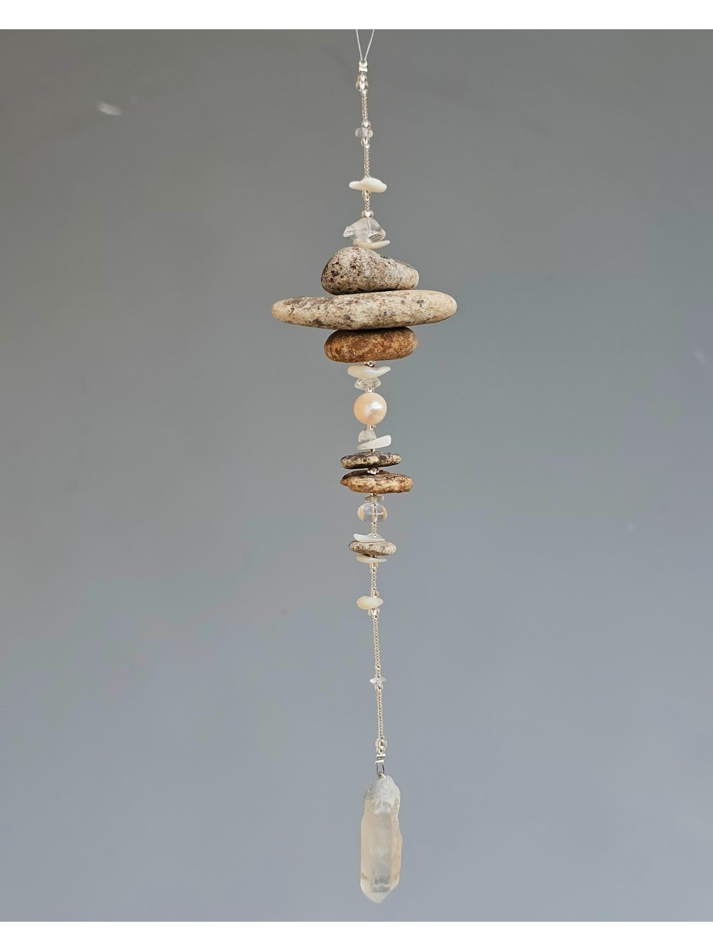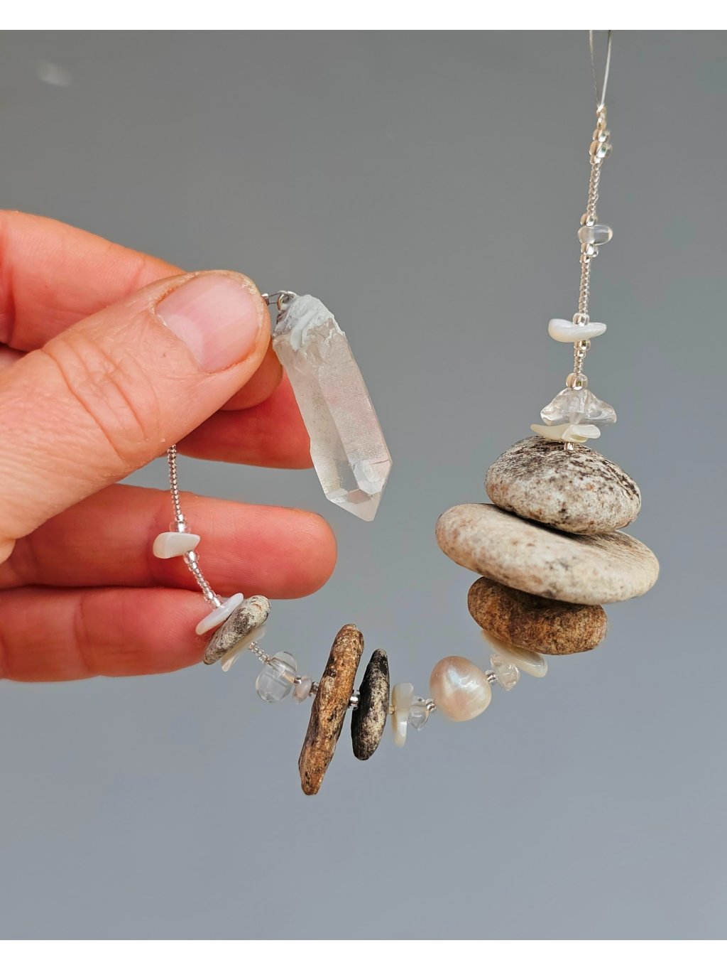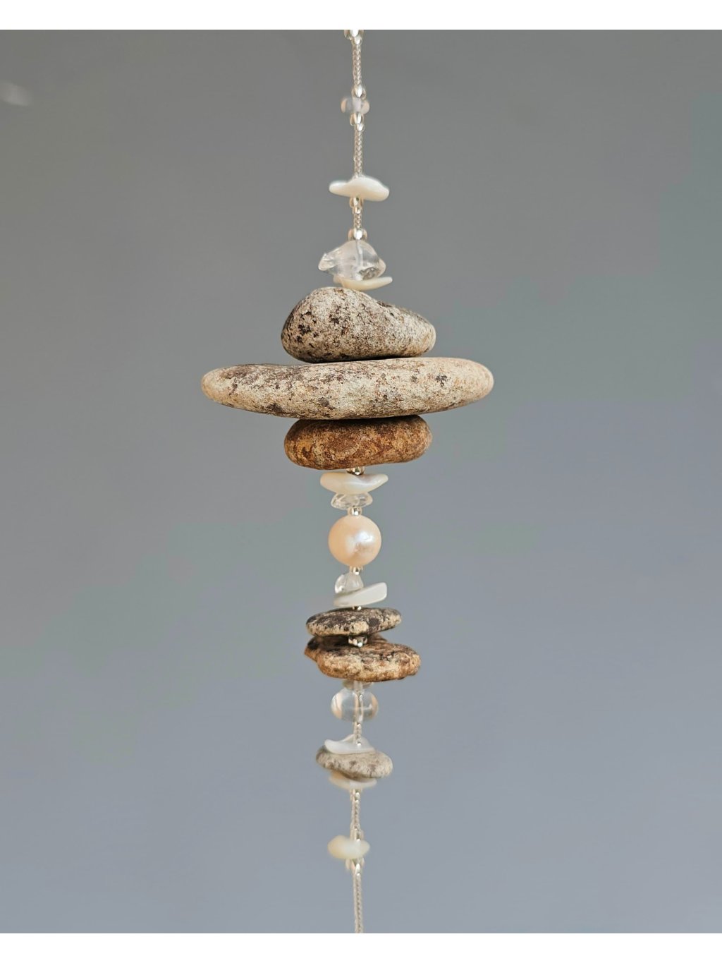 V těchto něžných kamenných dekoracích pro vás oživuji vlastnoručně nasbírané oblázky z břehů milované řeky Ohře (Agary). Kamínky nacházím v meandrech na Libochovicku – vybírám měkčí a lehounké sedimenty jako jílovce, slínovce, prachovce a opuky, které řeka ohladila a obohatila o unikátní kresbu. Tyto nenápadné pamětníky pradávného českého moře kombinuji s českým rokajlem Preciosa a přírodními krystaly či surovými kousky polodrahokamů (ametyst, křišťál, růženín). Závěsné krystaly podporují tok chi v duchu umění Feng shui.