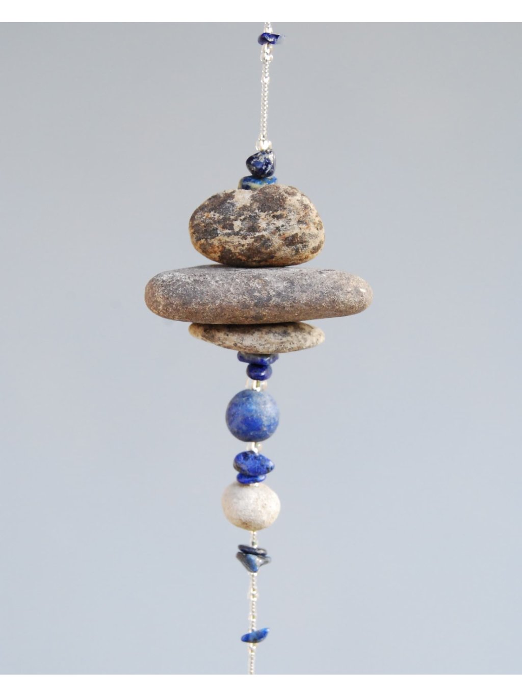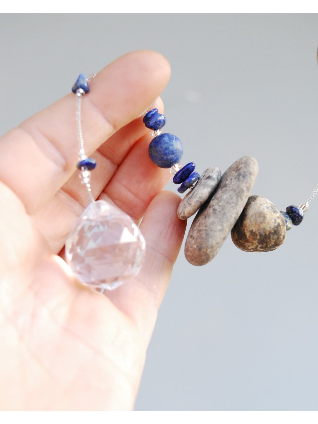 | Materiál: | Lapis lazuli, říční kamínky z Ohře, skleněný broušený ověs, ocelové lanko, skleněný rokajl Preciosa. |