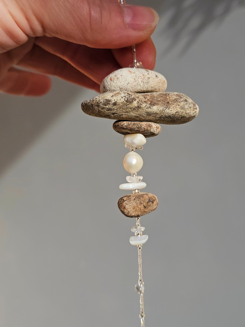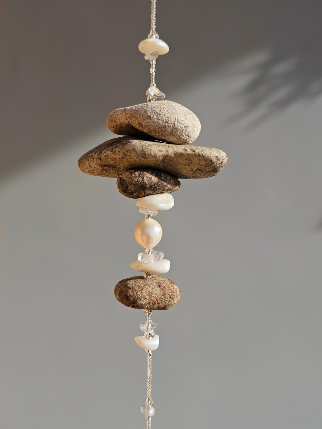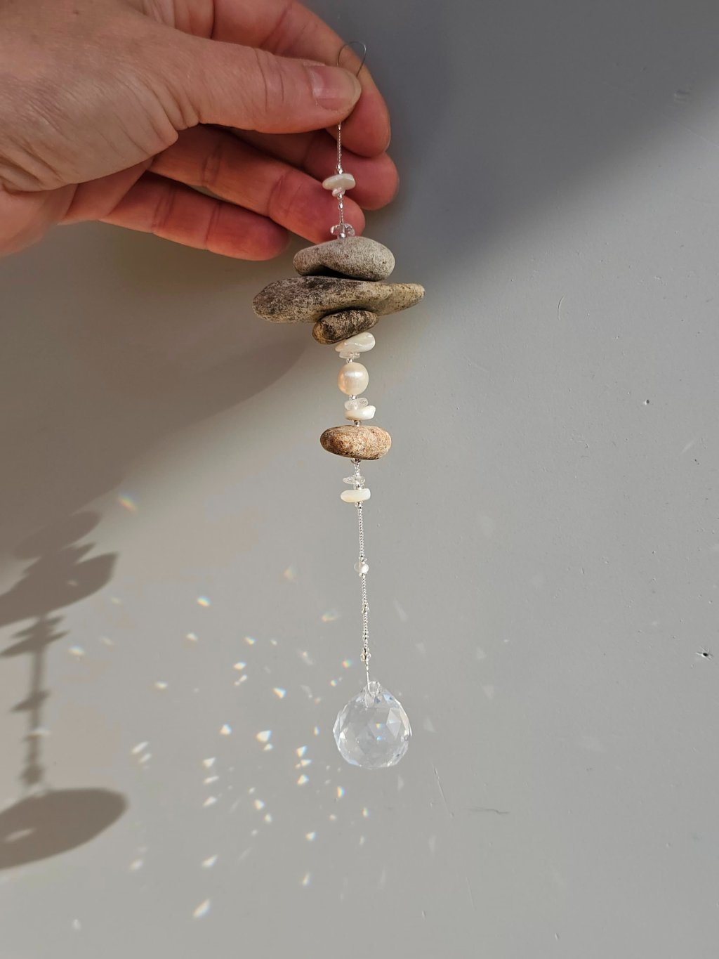 Tyto nenápadné pamětníky pradávného českého moře kombinuji s kvalitním českým rokajlem Preciosa, přírodními polodrahokamy a skleněnými broušenými lapači slunce, které v duchu umění Feng shui podporují v prostoru tok chi. Při průchodu světla vám roztančí po místnosti stovky duhových světélek.