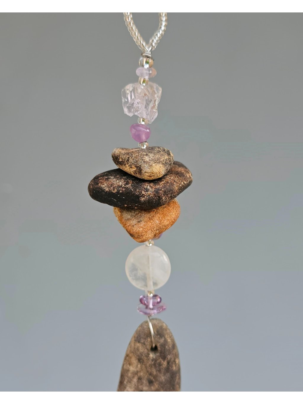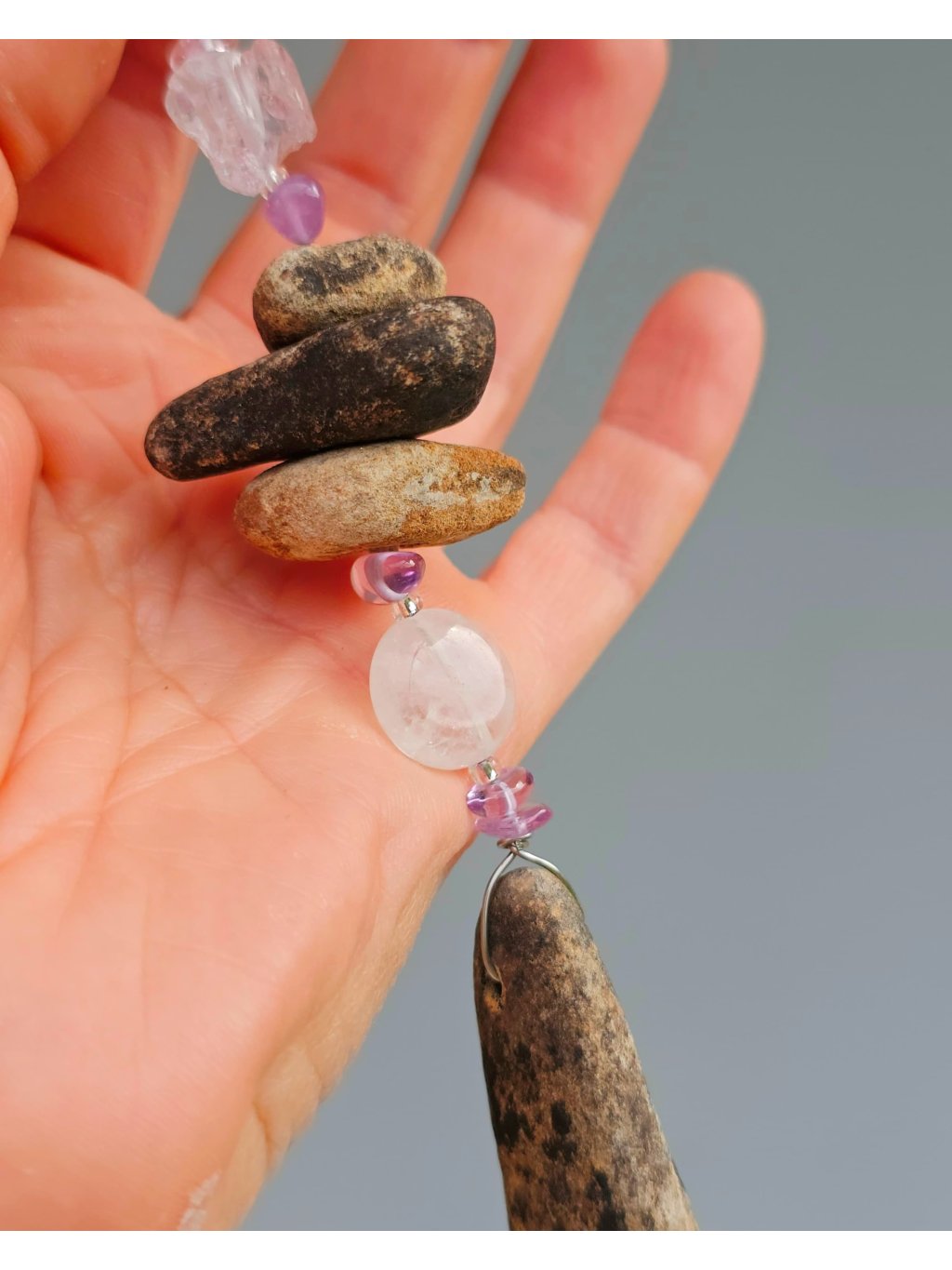 | Materiál: | Křišťál, ametyst, ametrin, skleněný rokajl, říční kameny Ohře, nerezový drátek, mosazná zvonkohra. |