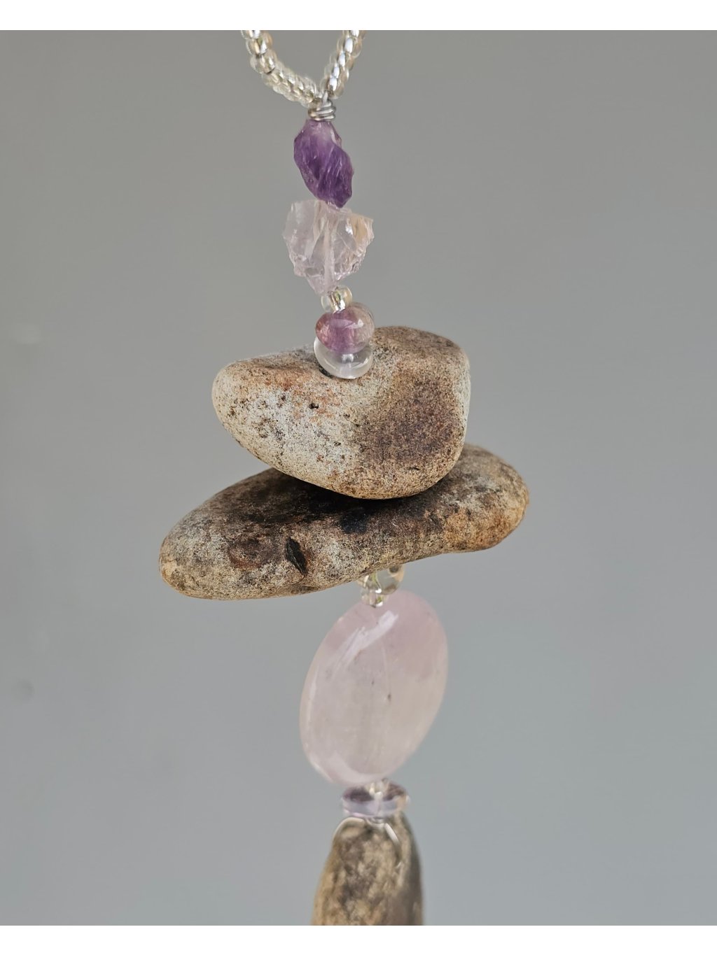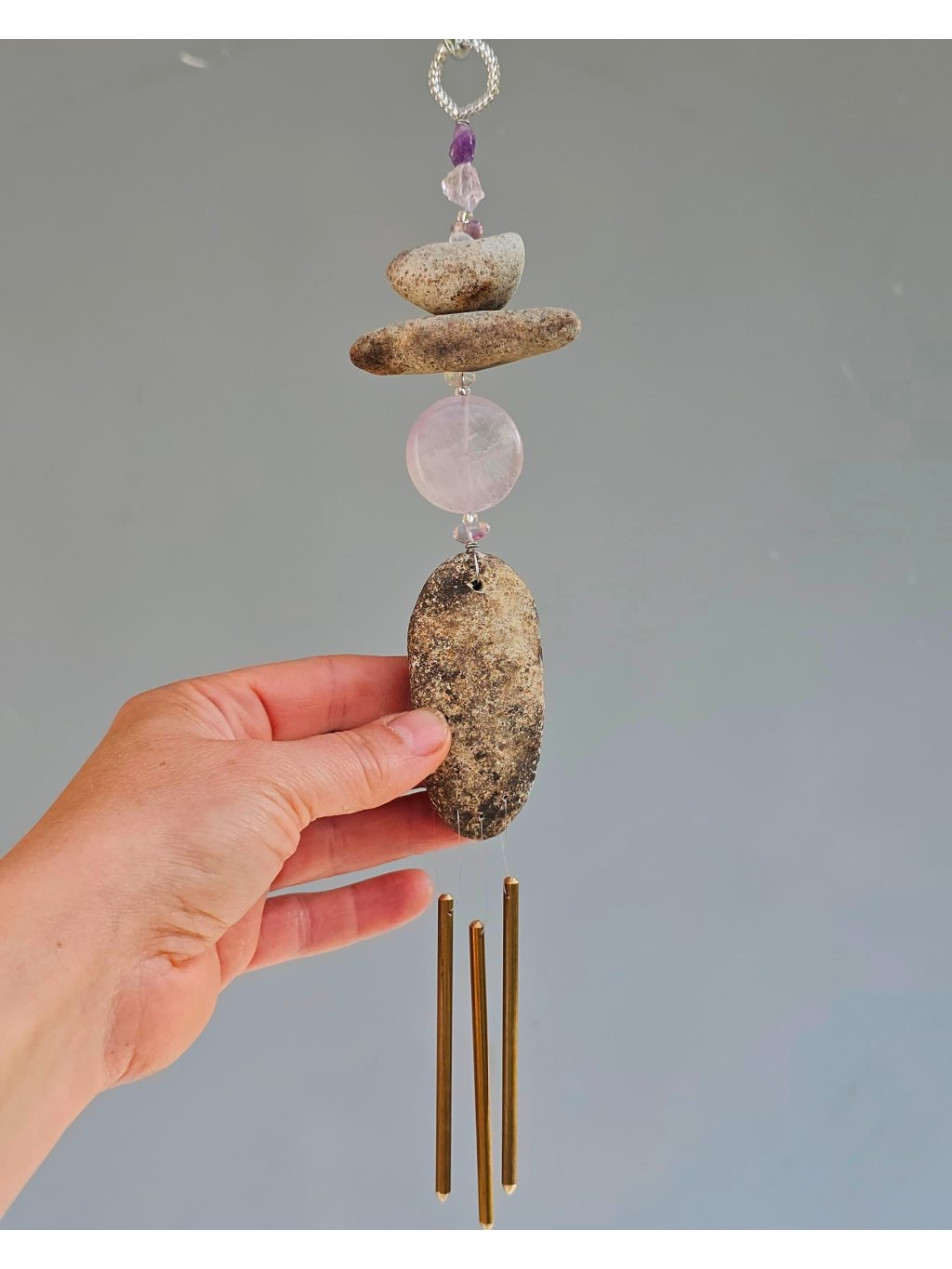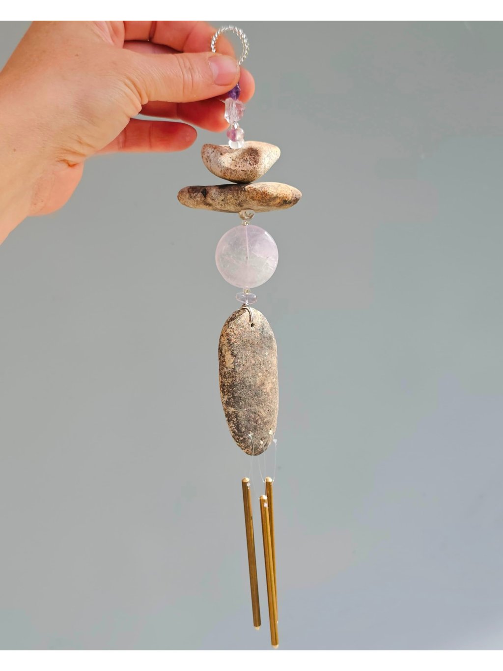 | Materiál: | Ametyst, ametrin, skleněný rokajl, říční kameny Ohře, nerezový drátek, mosazná zvonkohra. |