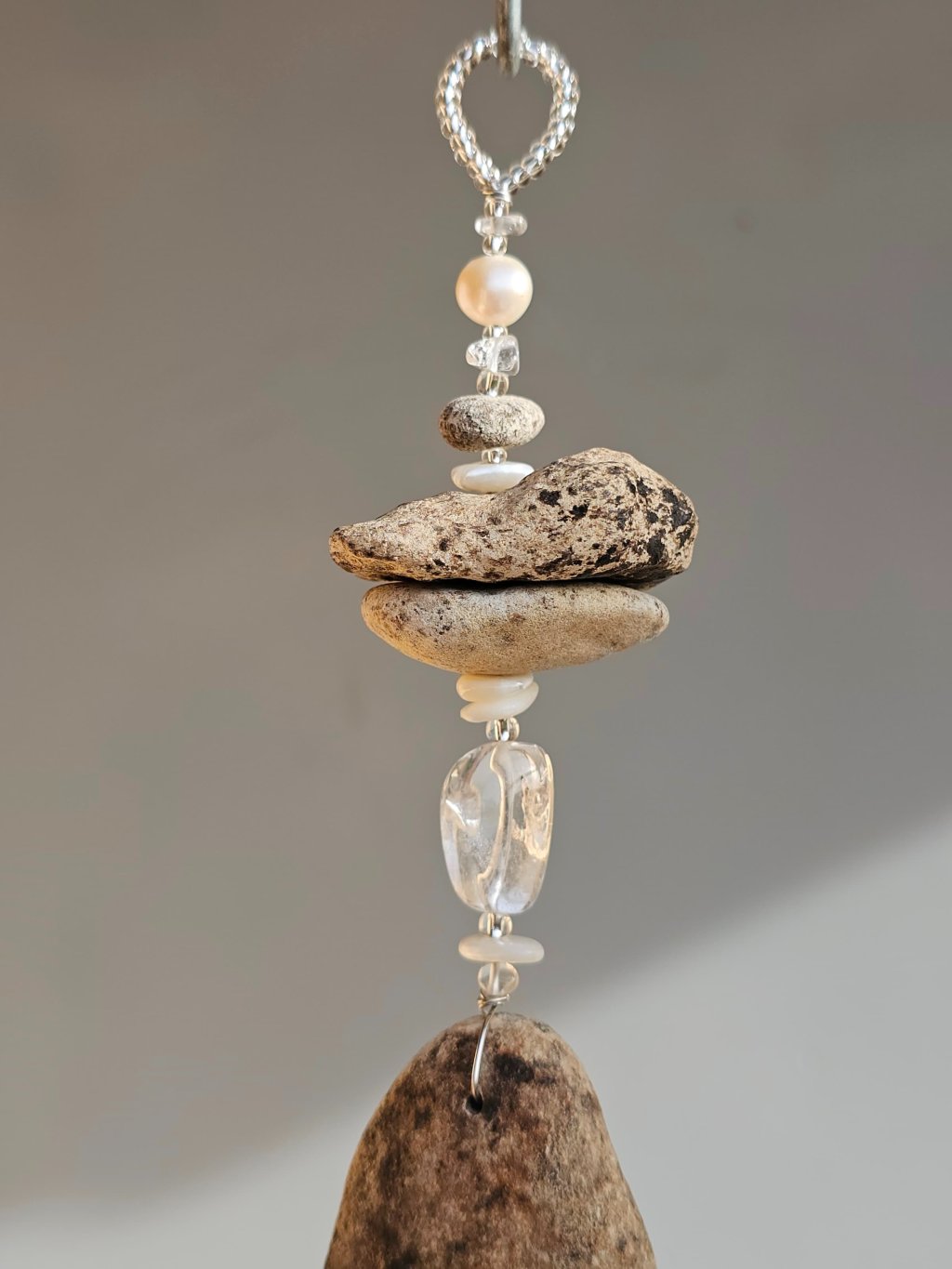 | Materiál: | Křišťál,říční perla, perleť, skleněný rokajl, říční kameny Ohře, nerezový drátek, mosazná zvonkohra. |