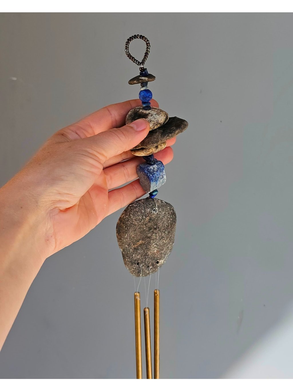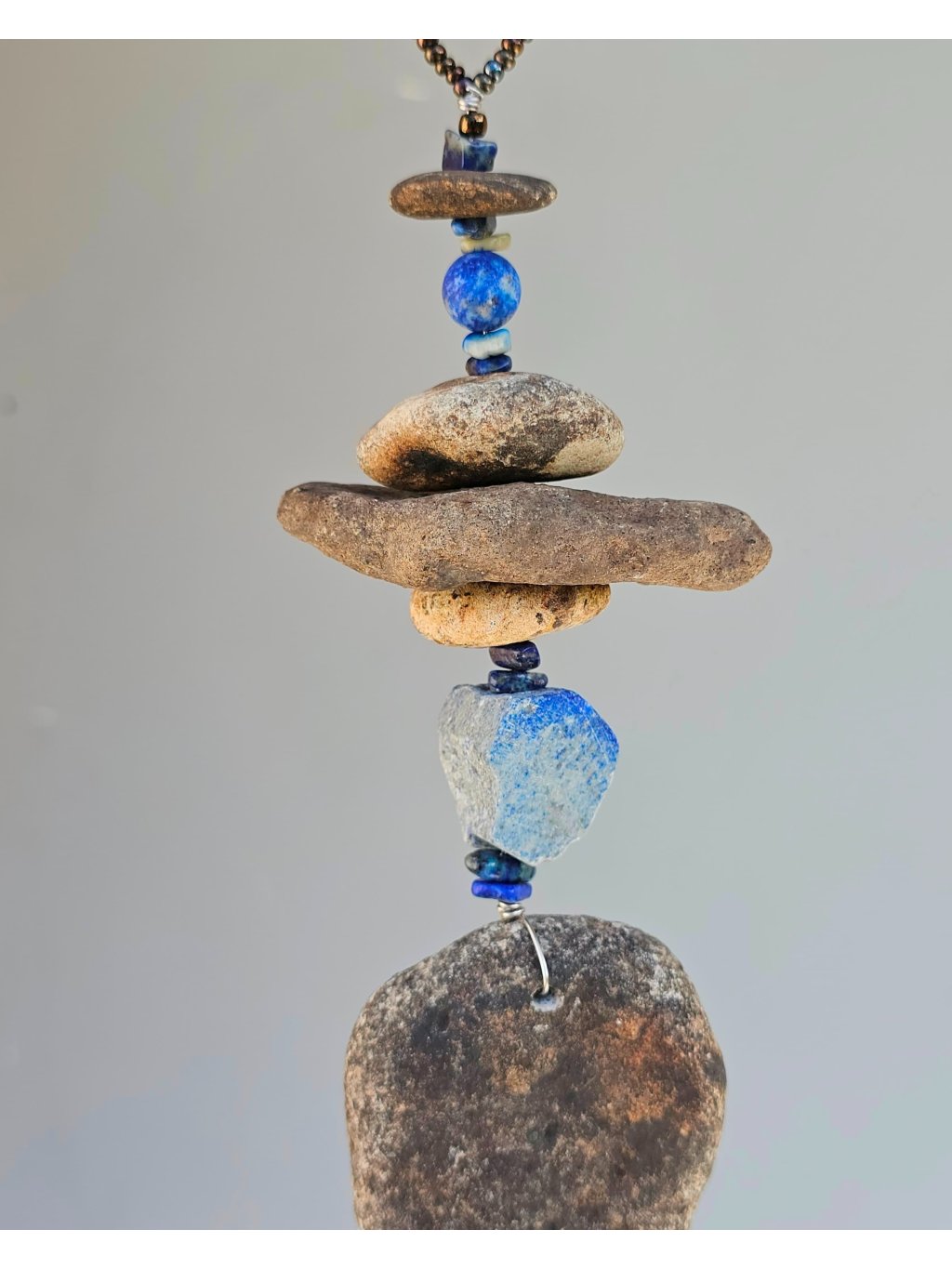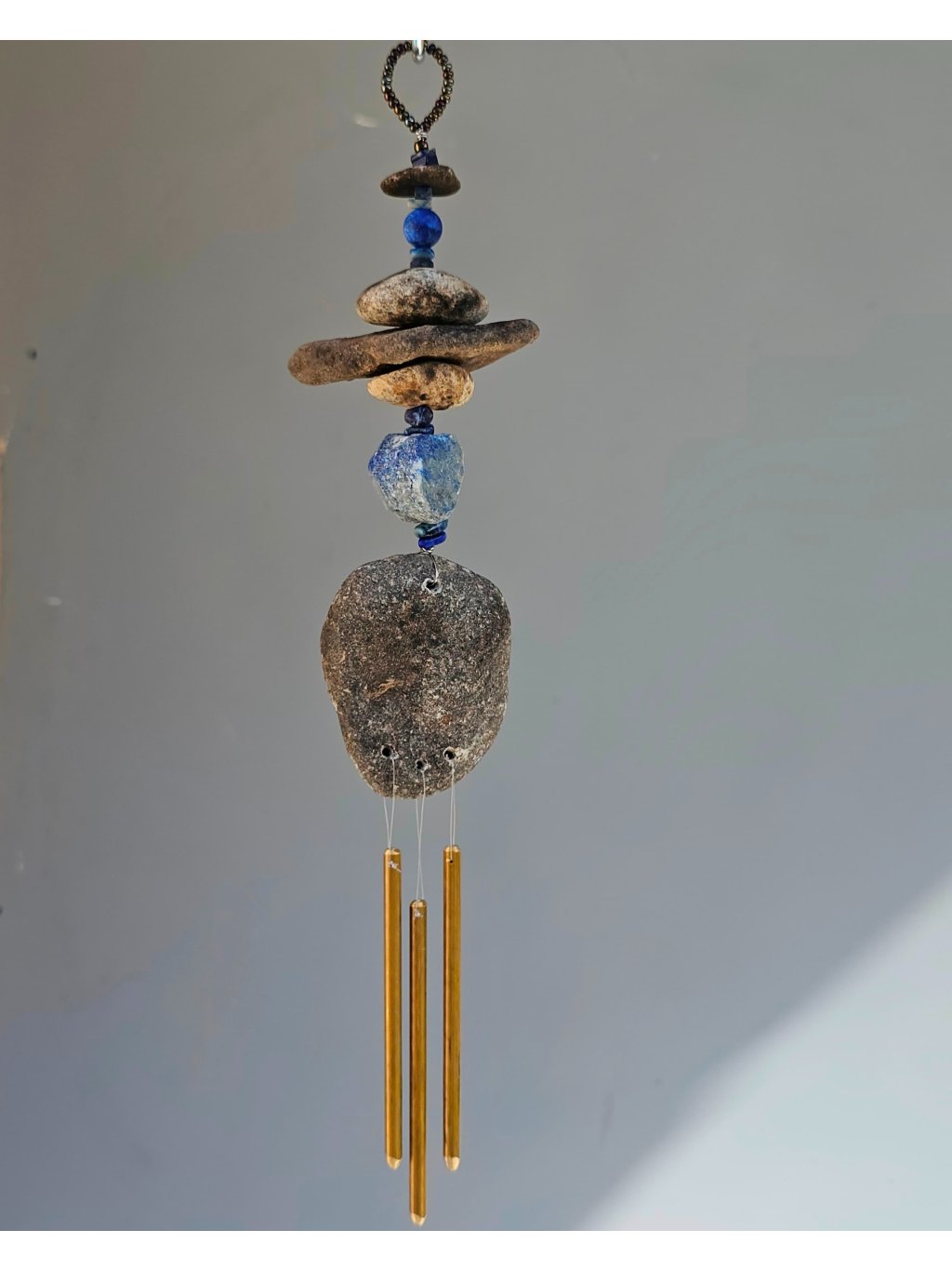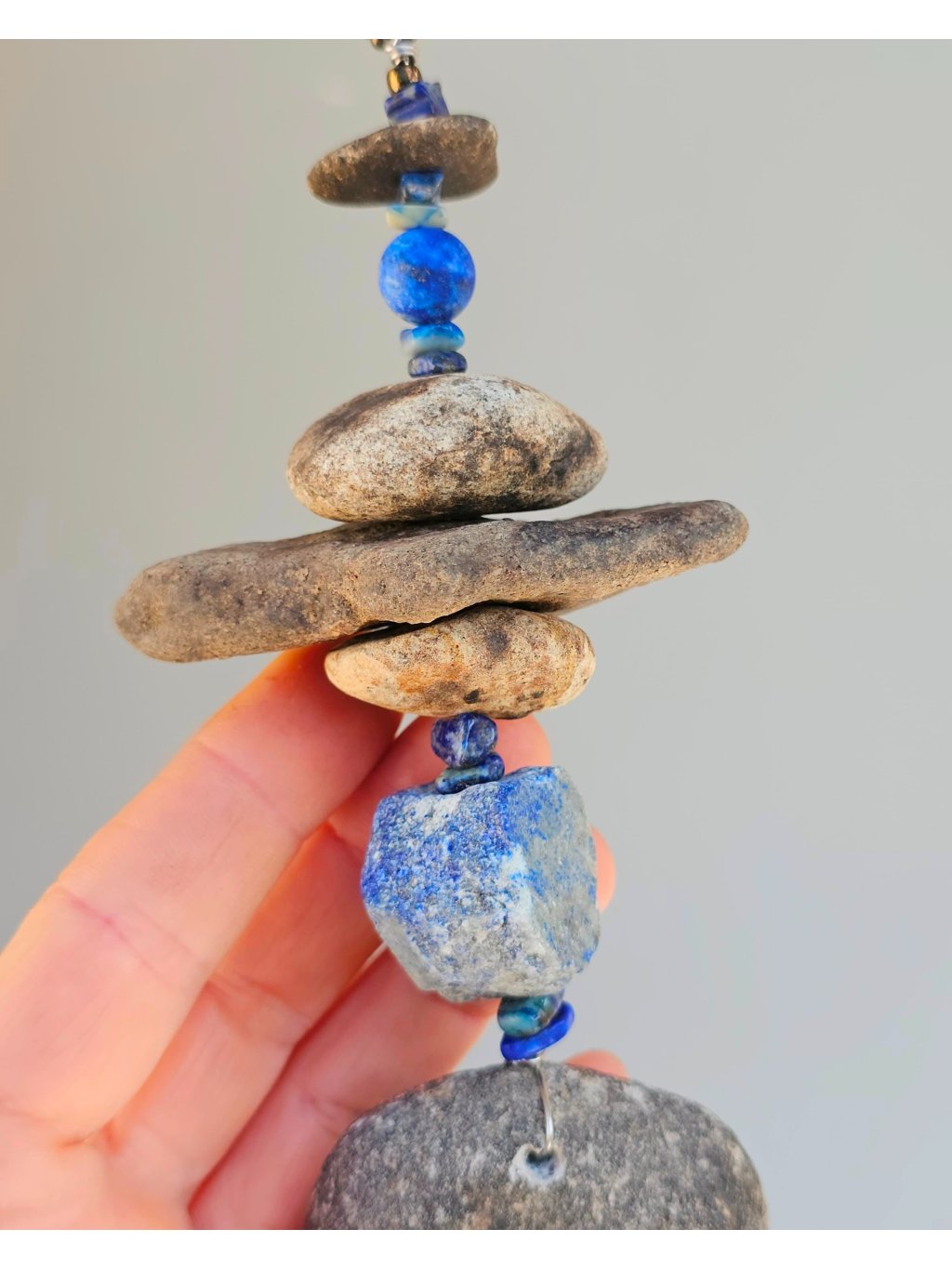 | Materiál: | Lapis lazuli, opracovaný i surový, skleněný rokajl, říční kameny Ohře, nerezový drátek, mosazná zvonkohra. |