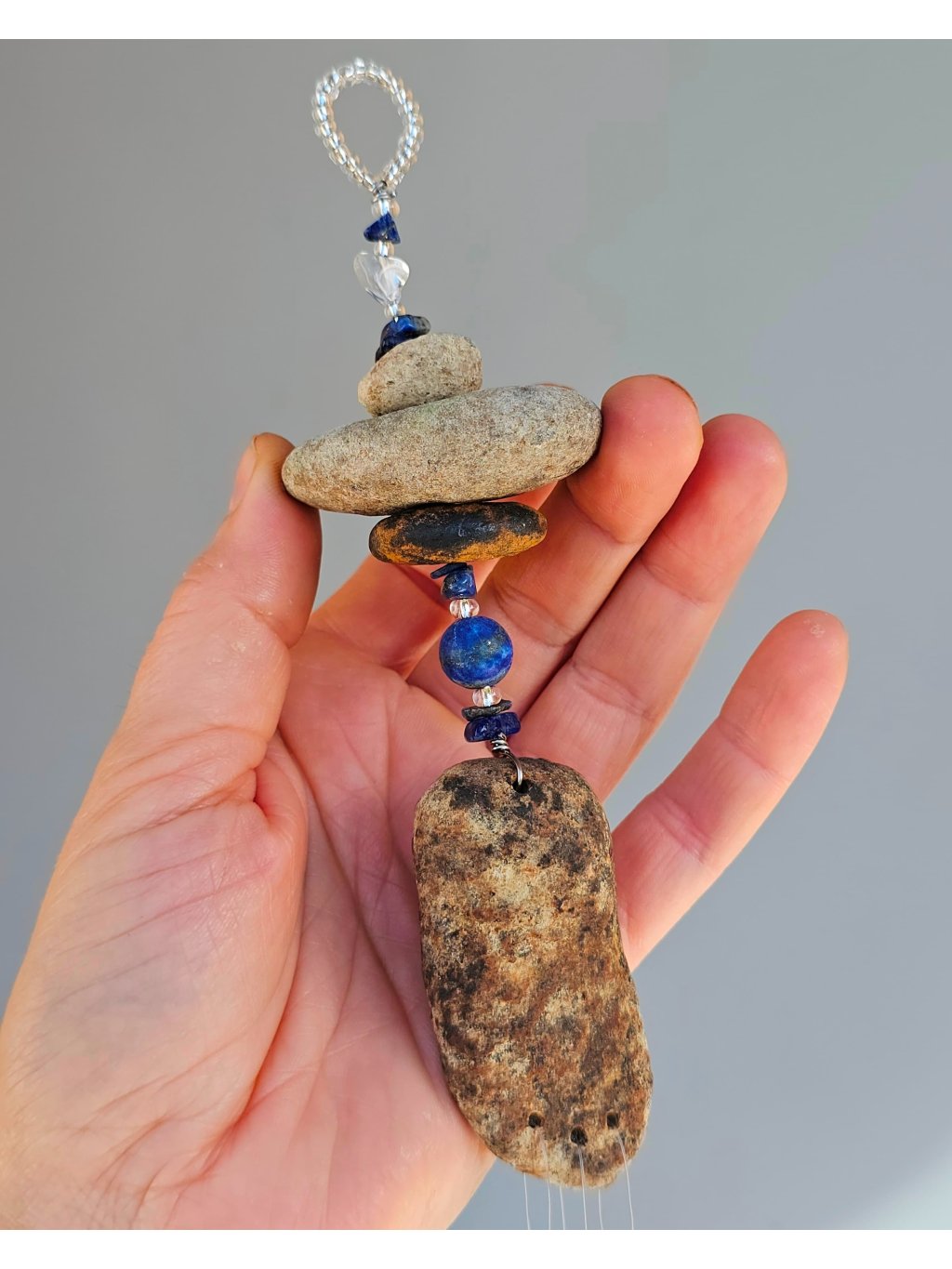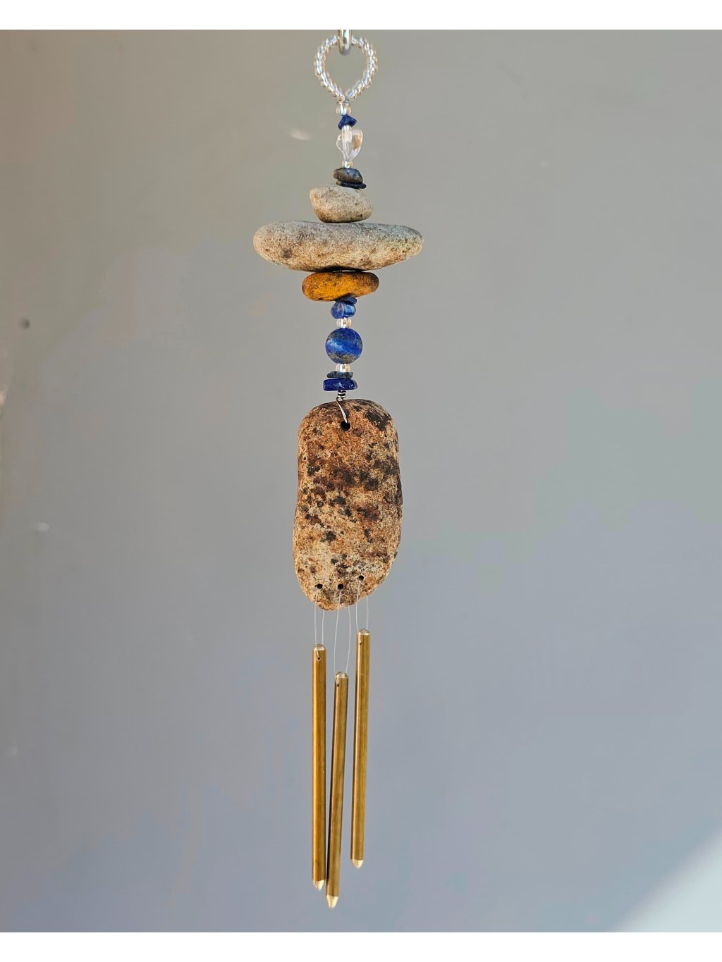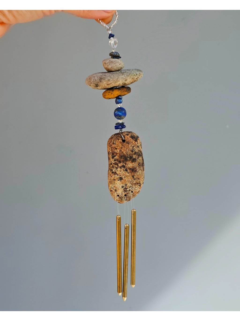 | Materiál: | Lapis lazuli, korálek křišťálu, skleněný rokajl, říční kameny Ohře, nerezový drátek, mosazná zvonkohra. |