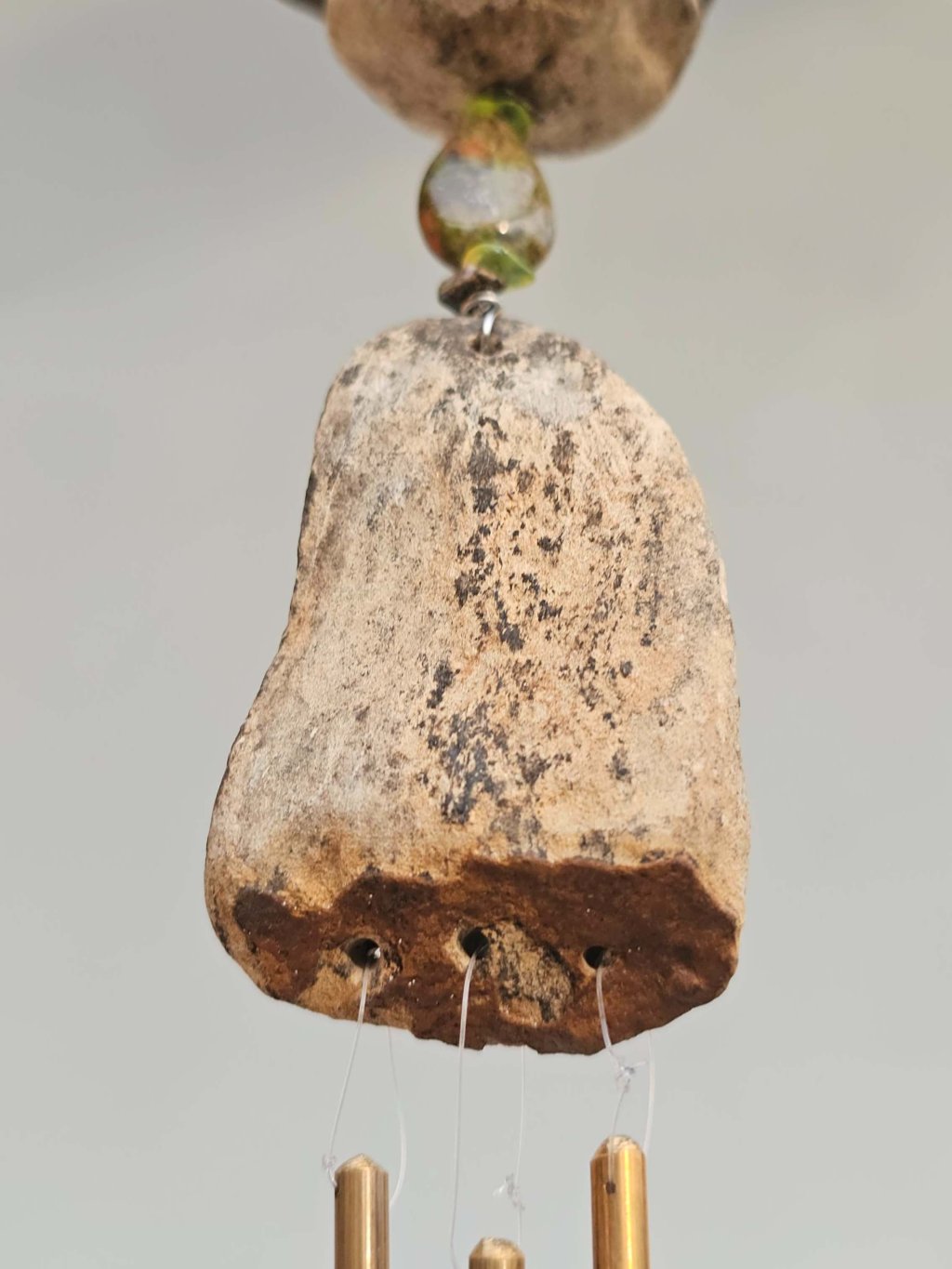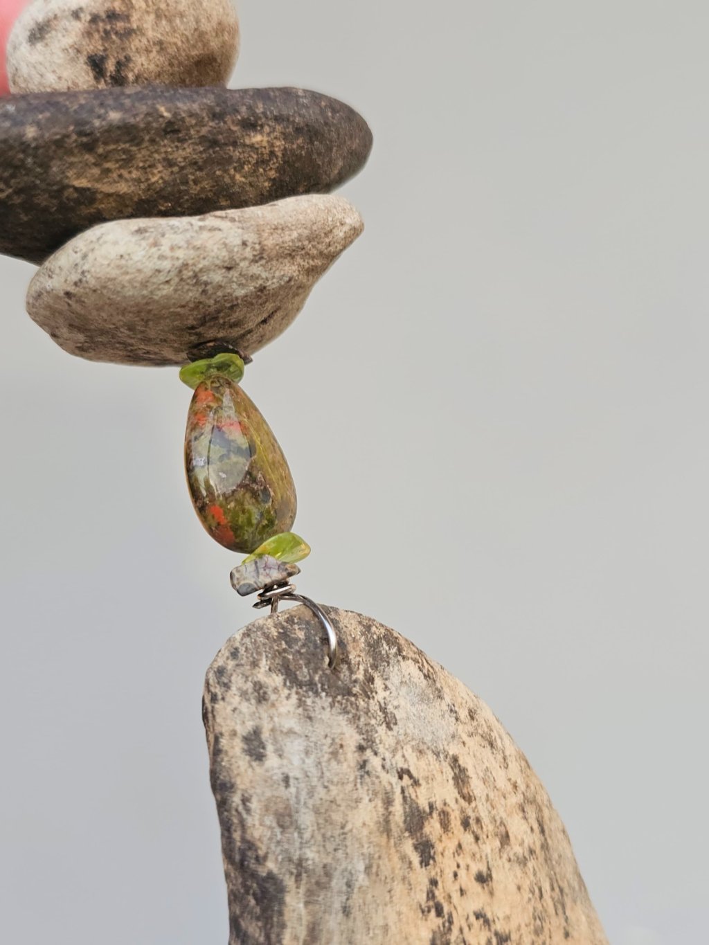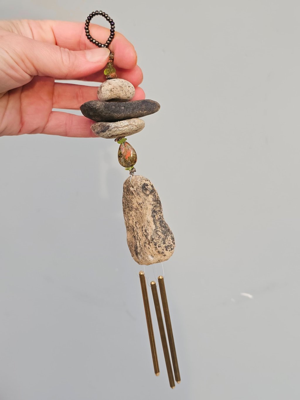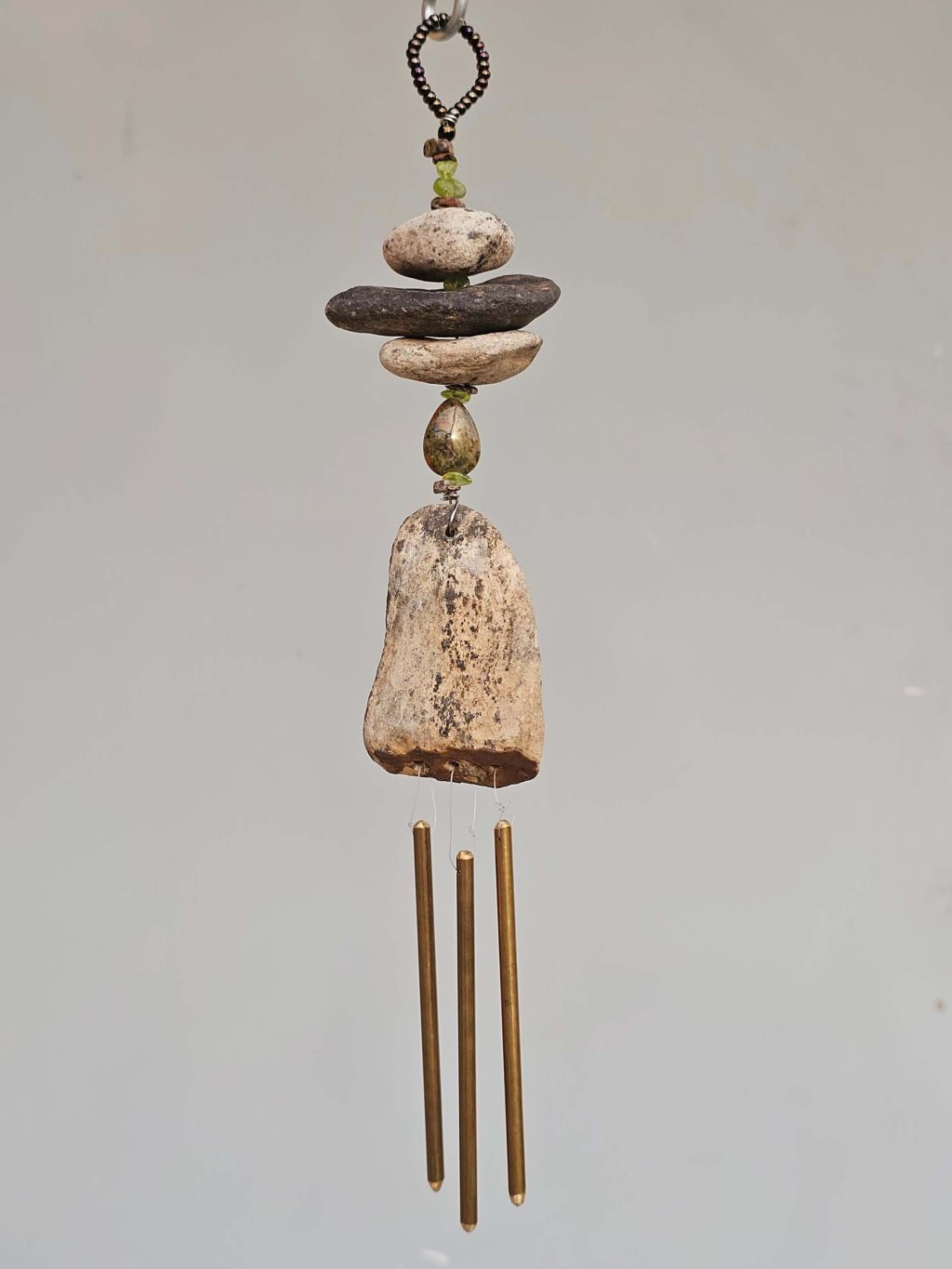| Materiál: | Unakit, olivín, skleněný rokajl, říční kameny Ohře, nerezový drátek, mosazná zvonkohra. |