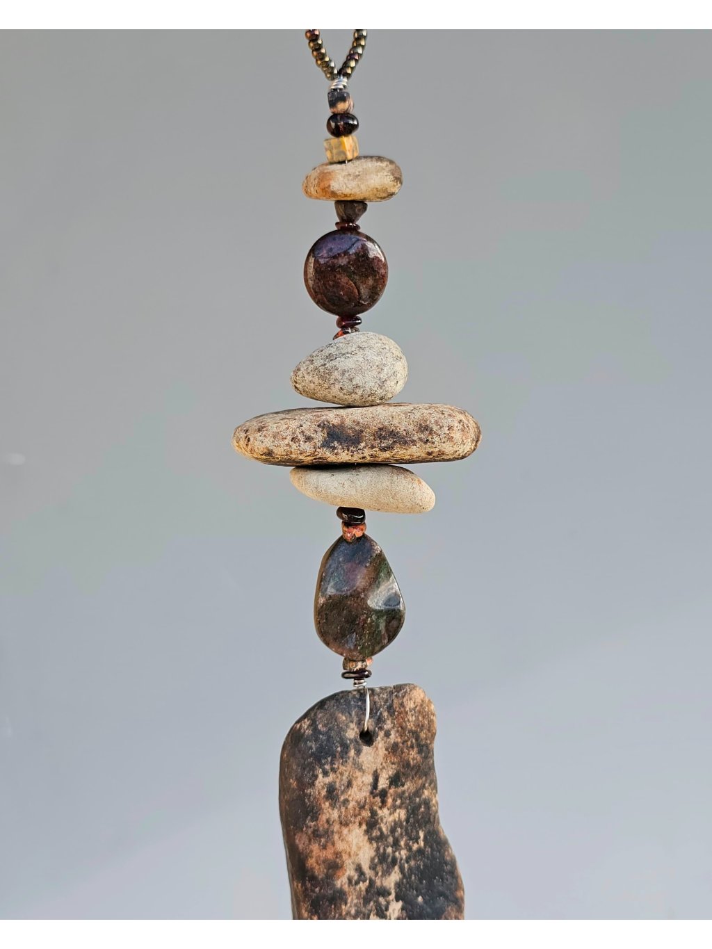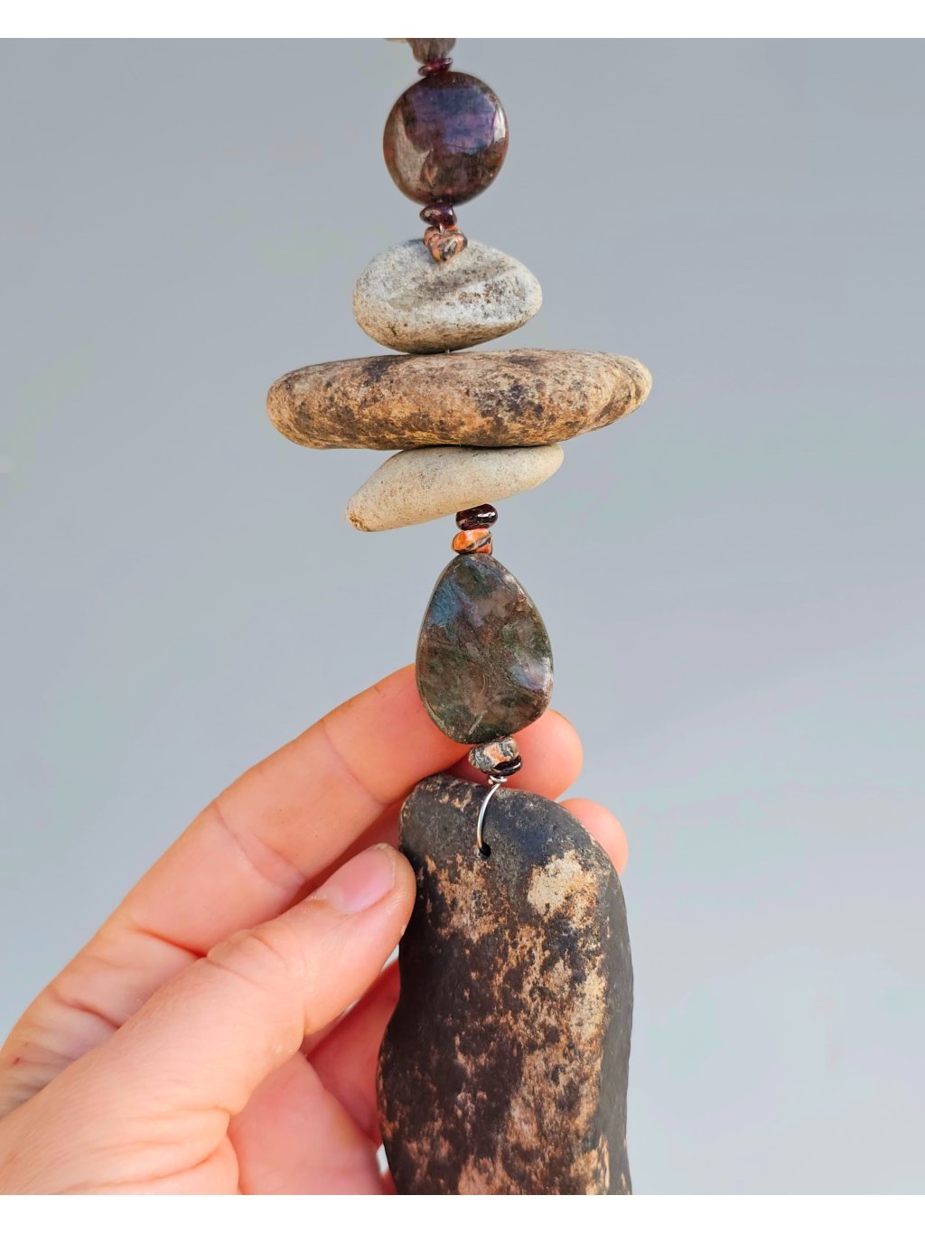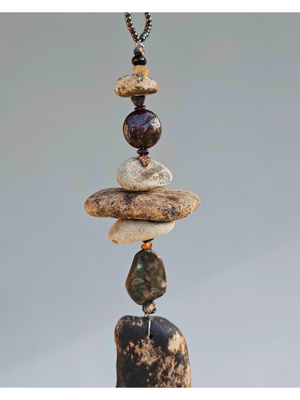 | Materiál: | Granát, skleněný rokajl, říční kameny Ohře, nerezový drátek, mosazná zvonkohra. |