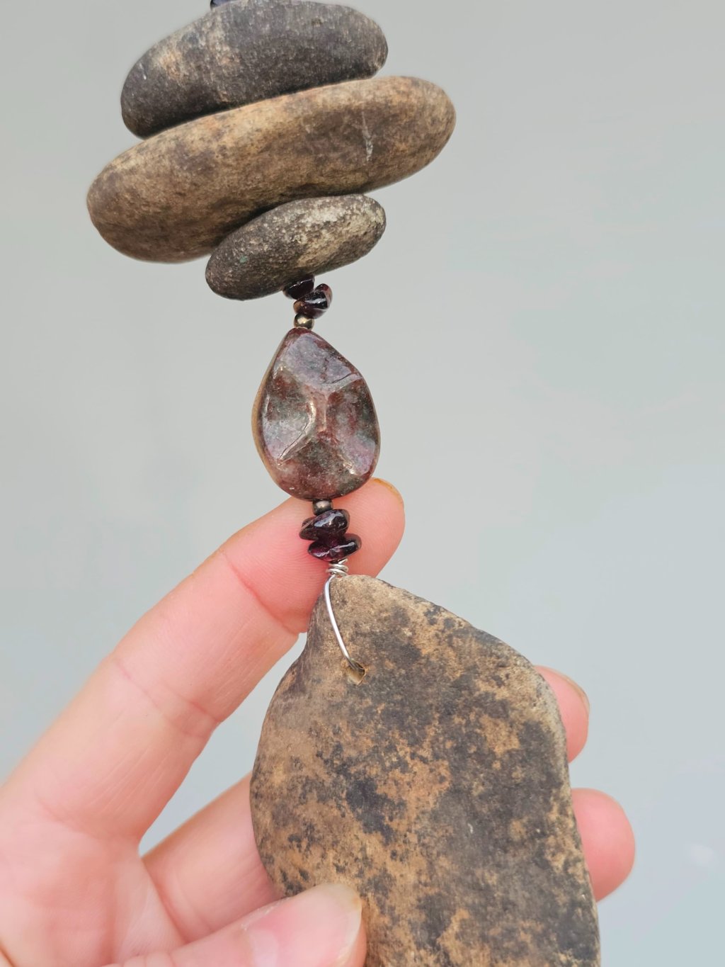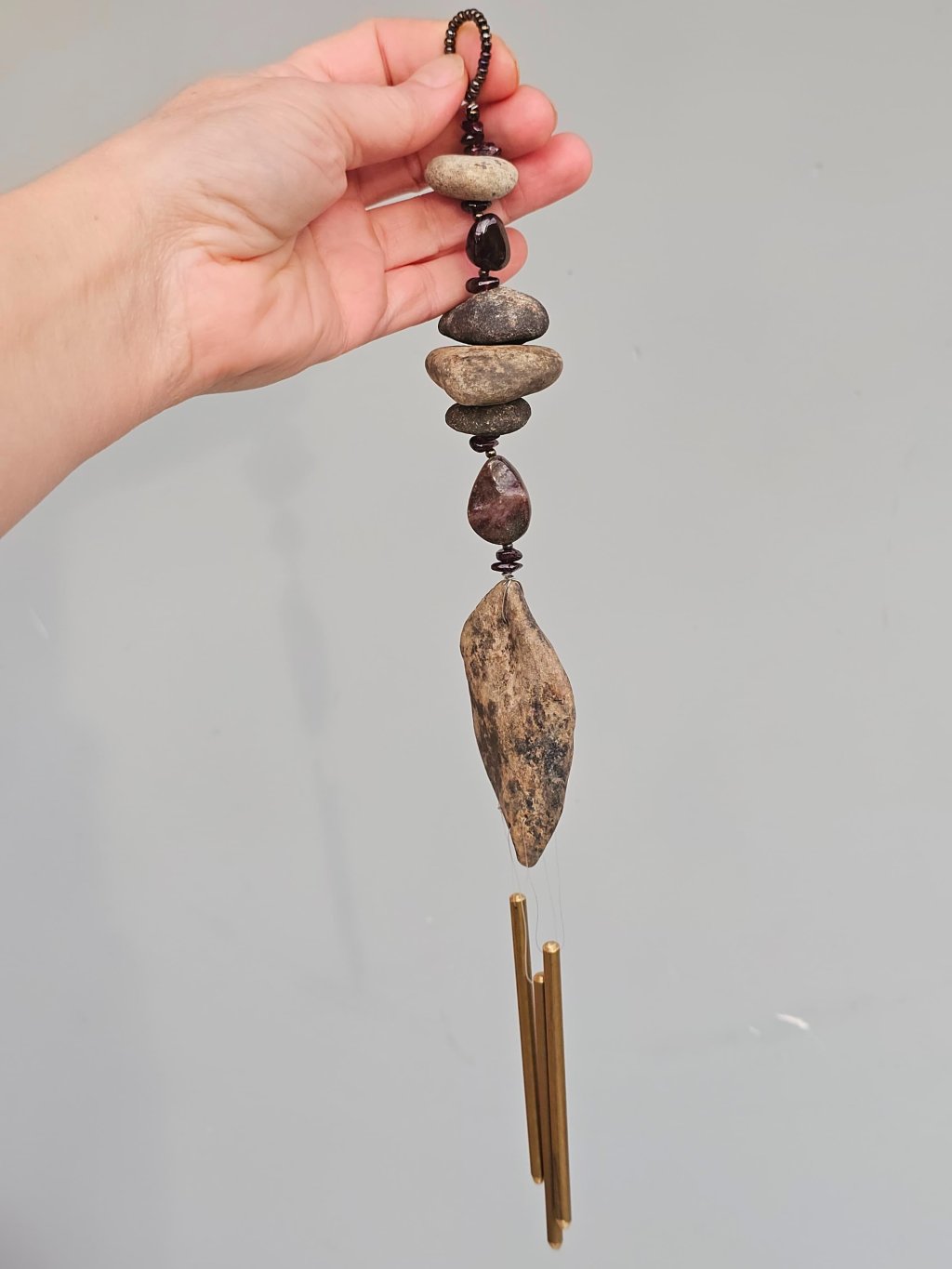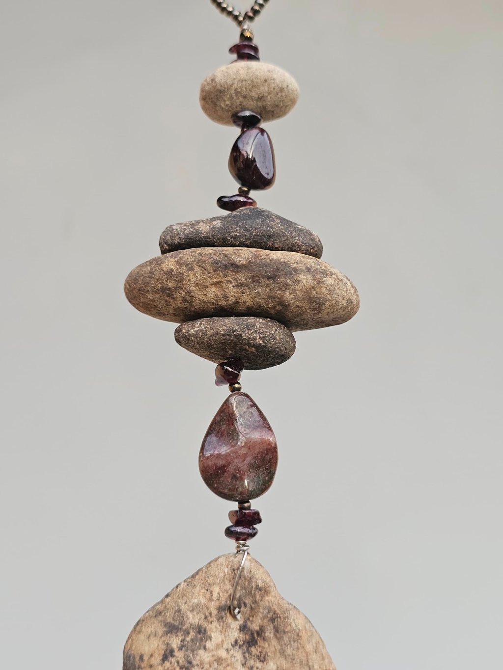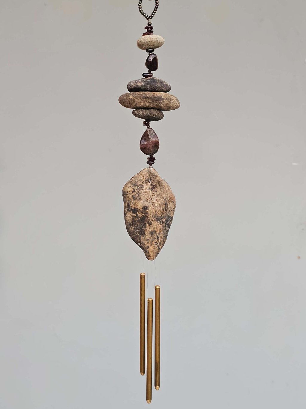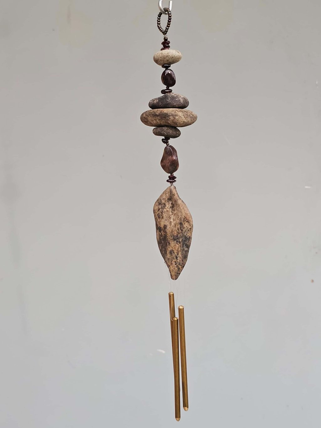 | Materiál: | Granát, skleněný rokajl, říční kameny Ohře, nerezový drátek, mosazná zvonkohra. |
