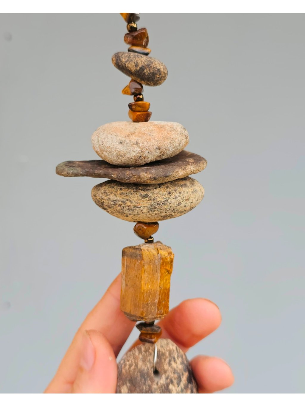 | Materiál: | Tygří oko, skleněný rokajl, říční kameny Ohře, nerezový drátek, mosazná zvonkohra. |