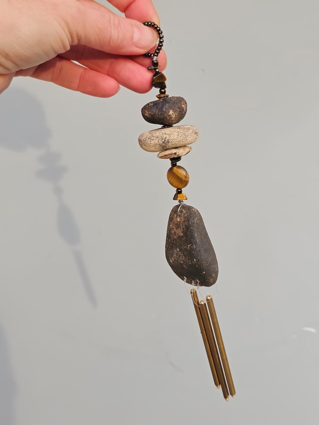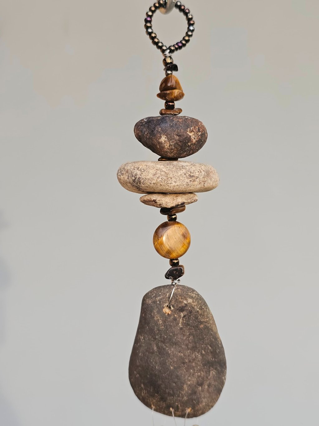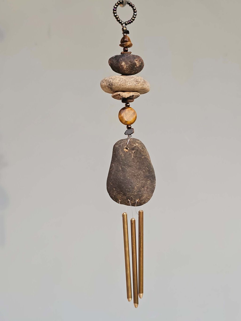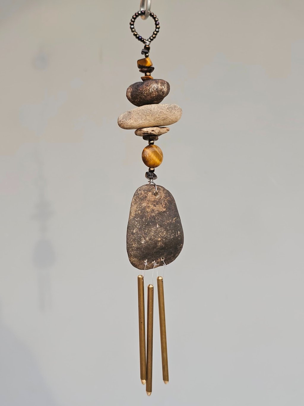 | Materiál: | Tygří oko, skleněný rokajl, říční kameny Ohře, nerezový drátek, mosazná zvonkohra. |