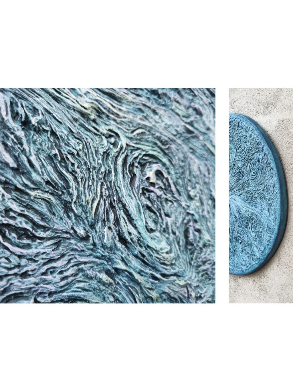 Plasticky modelovaný povrch reaguje na světelné podmínky a vytváří jemné, proměnlivé divadlo. Barva dotváří konkrétní význam jednotlivých děl.